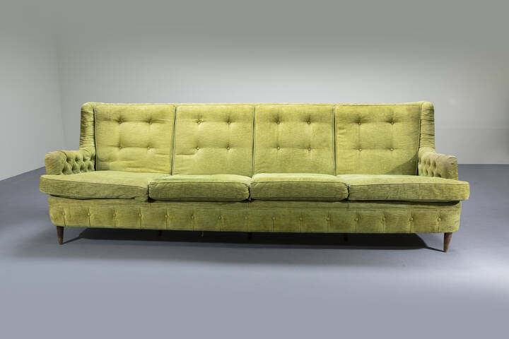 Divano con imbottitura rivestita in velluto, gambe coniche in legno.
