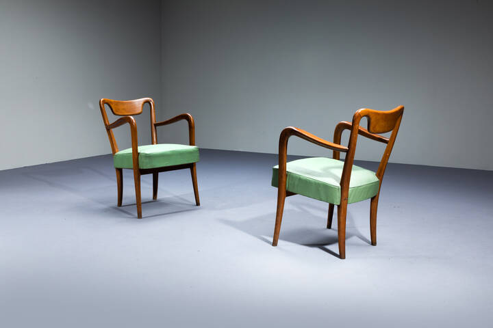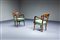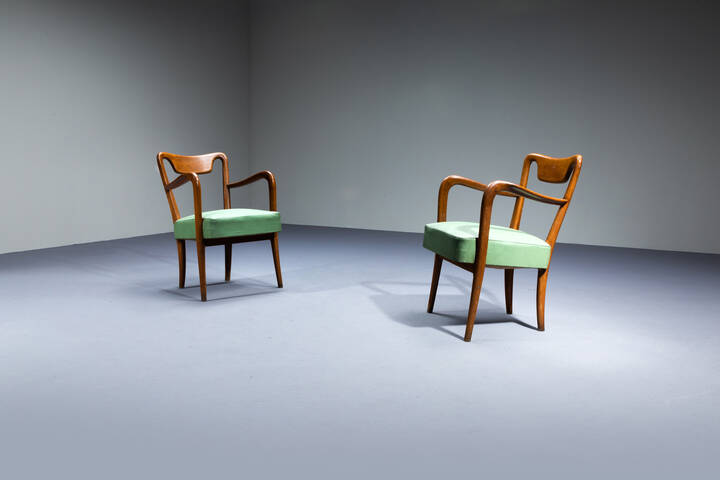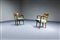 Coppia di poltrone con struttura in legno, sedute e schienali imbottiti rivestiti in skai.