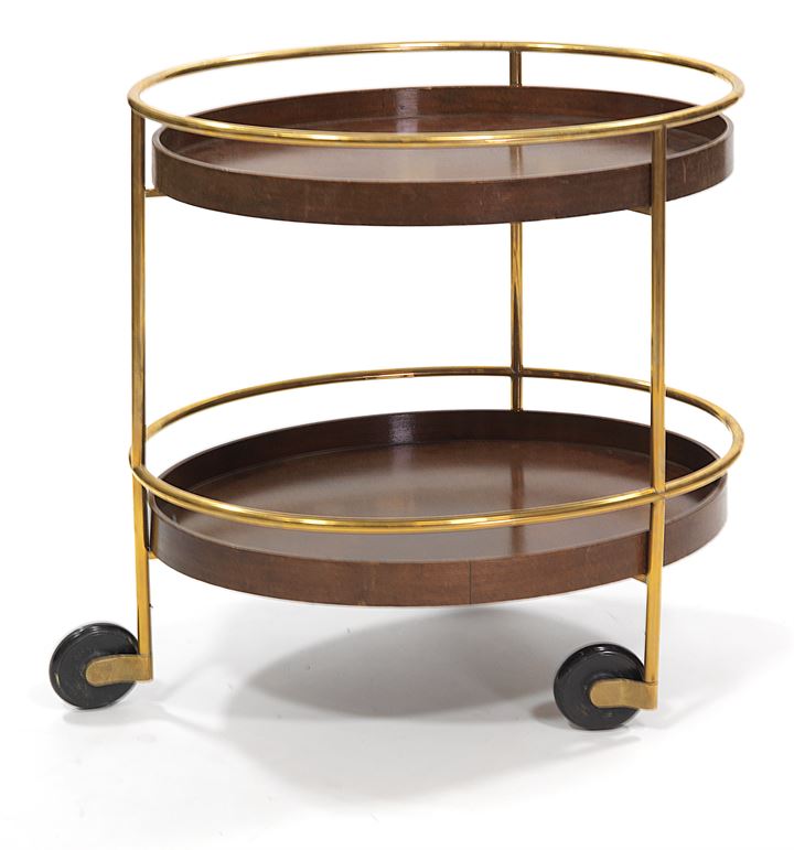 CARRELLO Carrello in ottone zapponato con due vassoi in noce, ruote in...