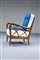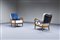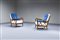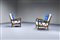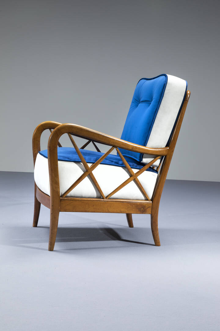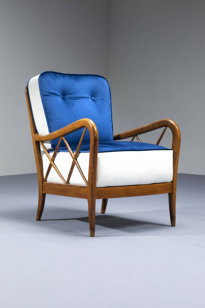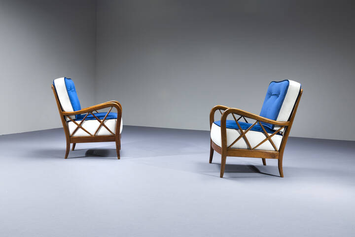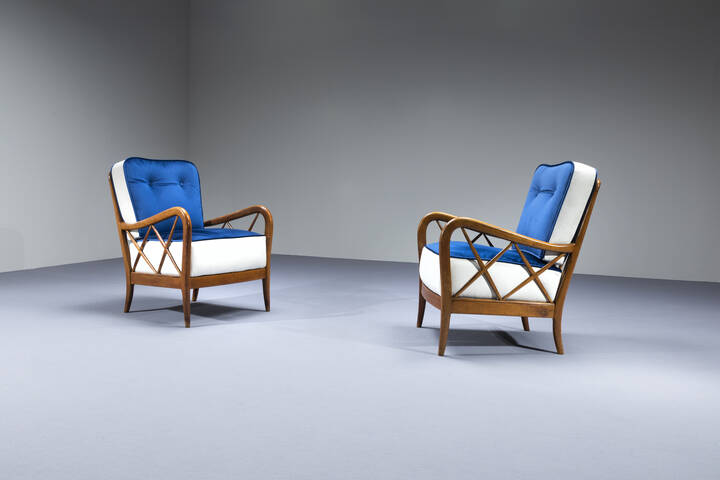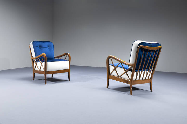 Coppia di poltrone con struttura in legno e rivestimenti in velluto bicolore.