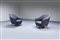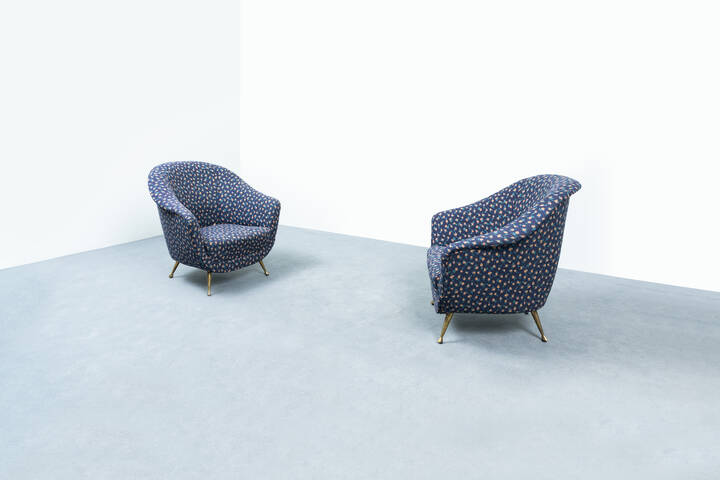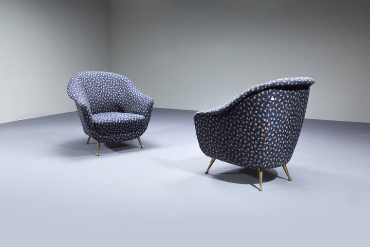 Coppia di poltrone con imbottitura rivestita in tessuto, gambe in ottone.