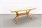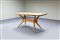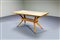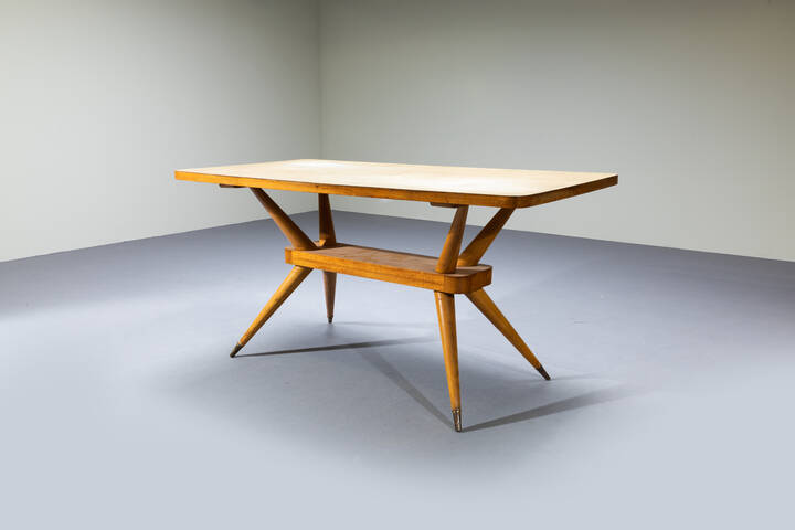 Tavolo in legno di noce, puntali in ottone, piano in legno laminato.