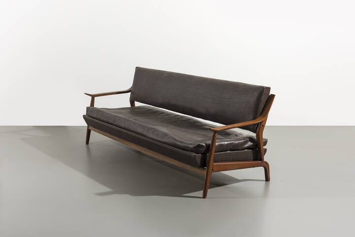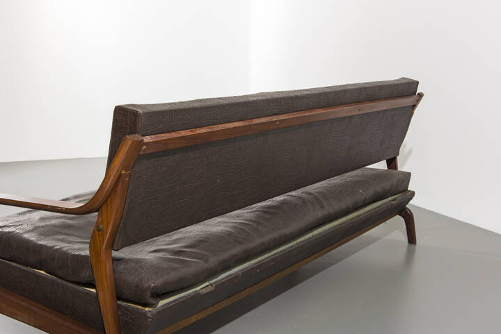 Divano con struttura in legno, imbottitura rivestita in similpelle.