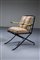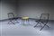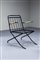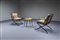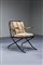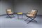 Coppia di poltrone con pouff in ferro laccato e materiale plastico, cuscini imbottiti rivestiti in tessuto.