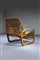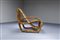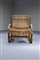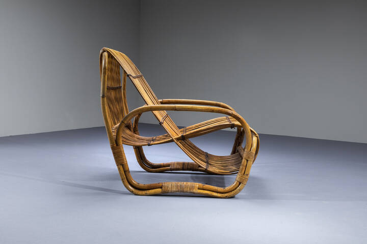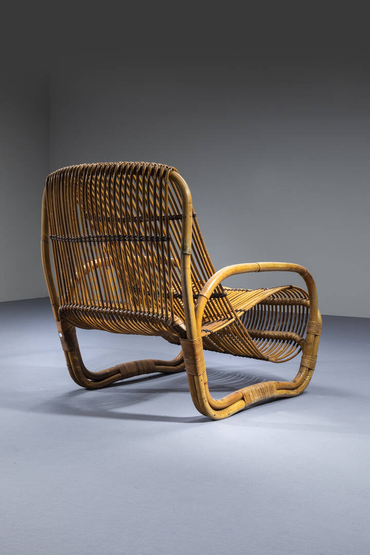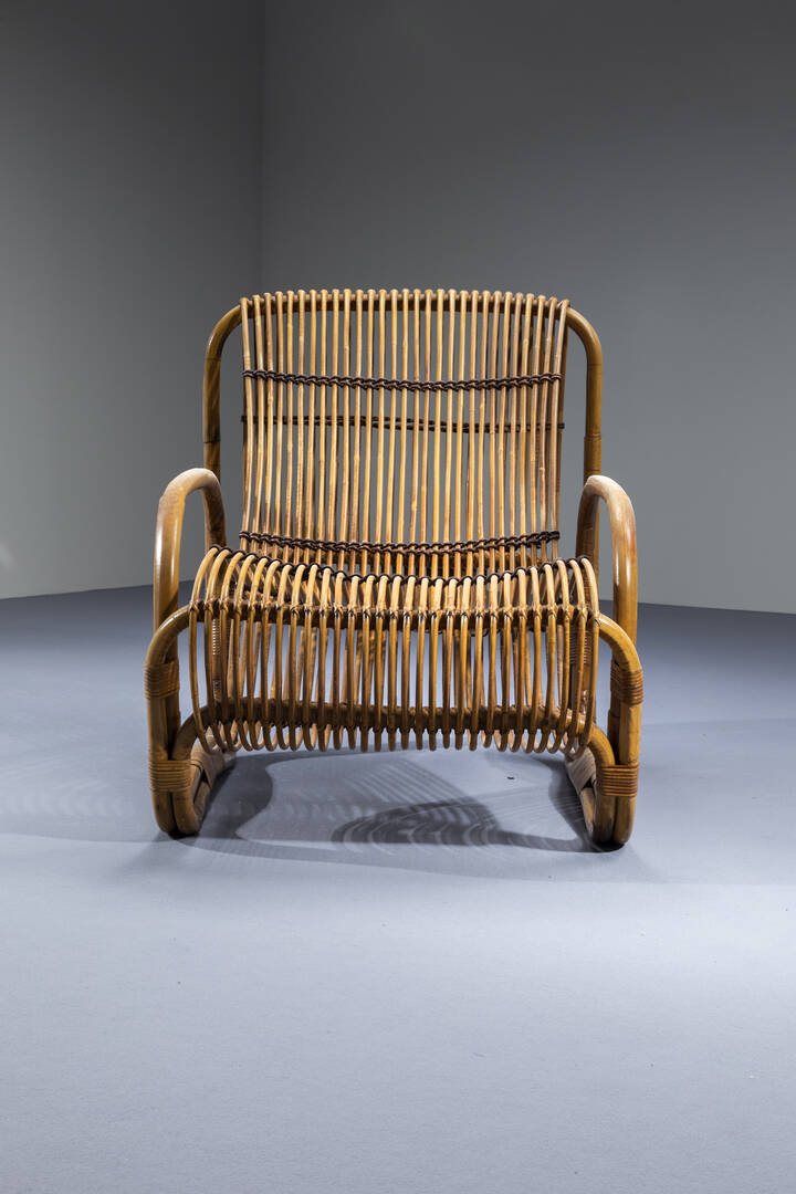 Poltrona a forma geometrica con struttura in bamboo e canna d’india, legature in cuoio intrecciato.