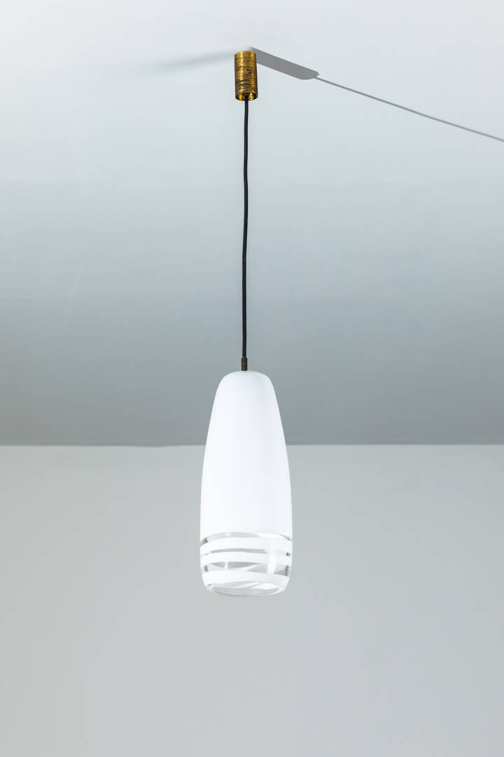 Lampada a sospensione in vetro lattimo e vetro trasparente, tige in ottone graffiato.
