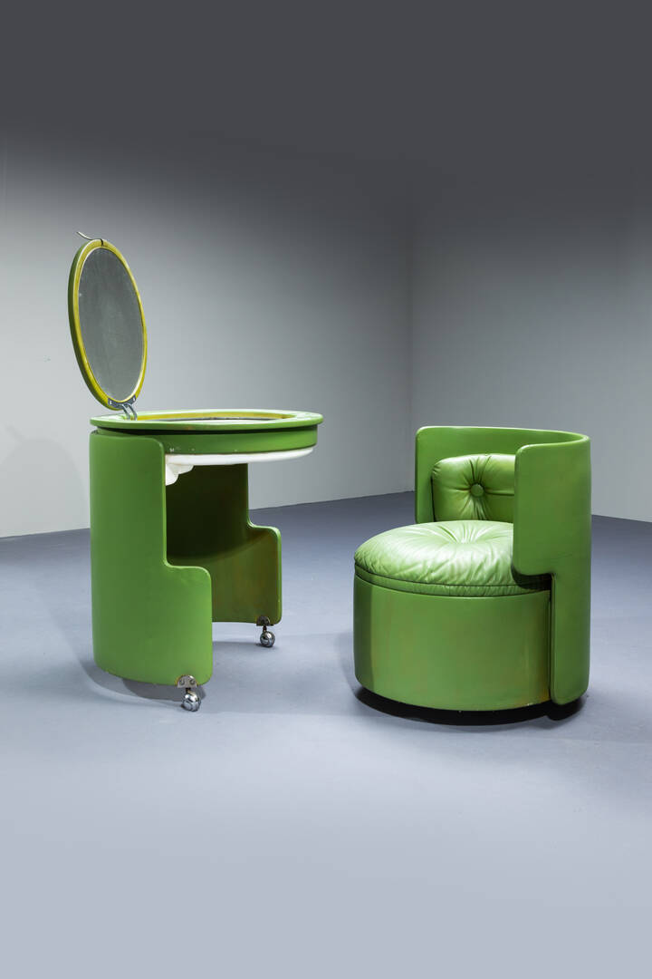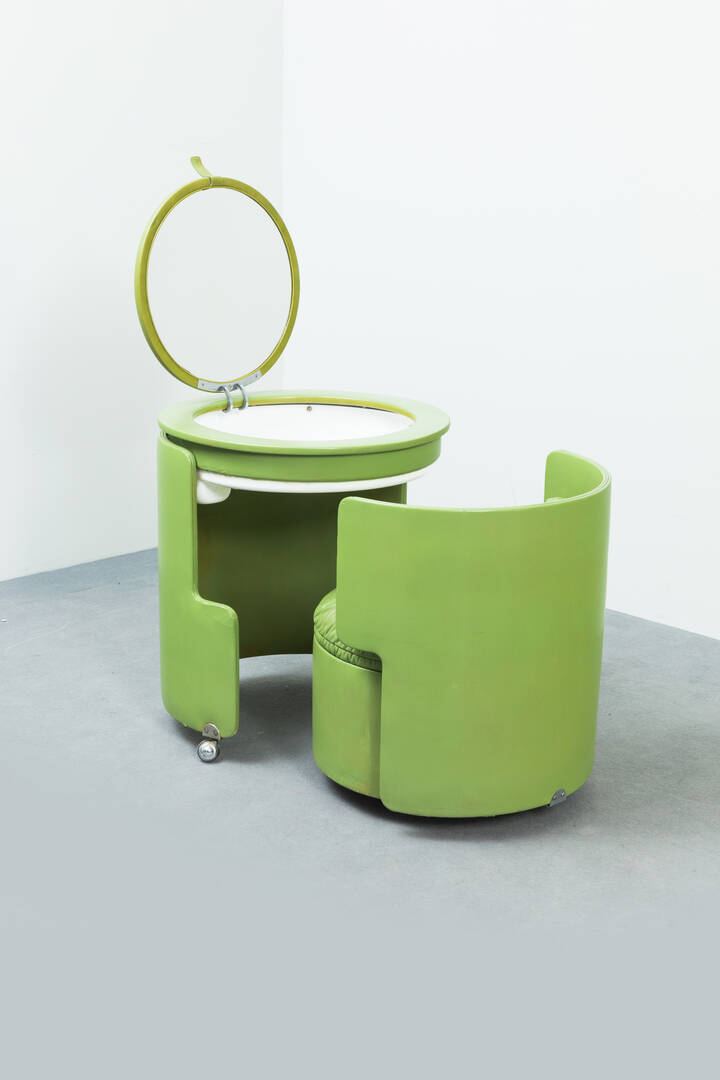 Poltroncina-toeletta in compensato curvato rivestito in cuoio.