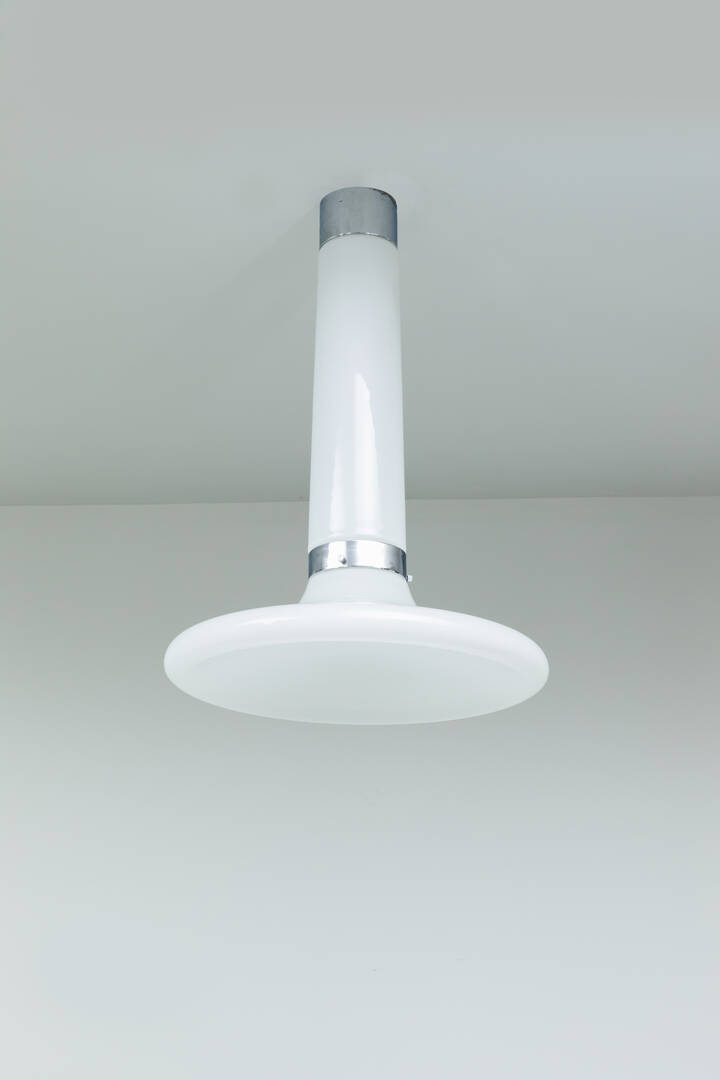 Lampadario in metallo cromato, diffusore in vetro opalino.