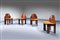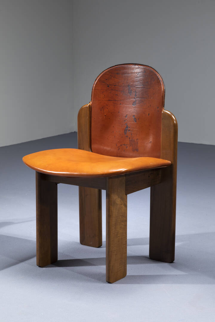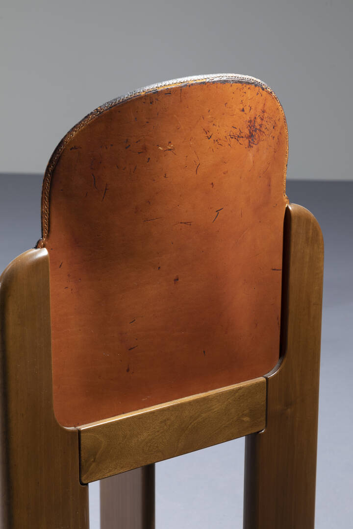 Quattro sedie con struttura in legno, schienali e sedili rivestiti in cuoio.