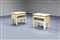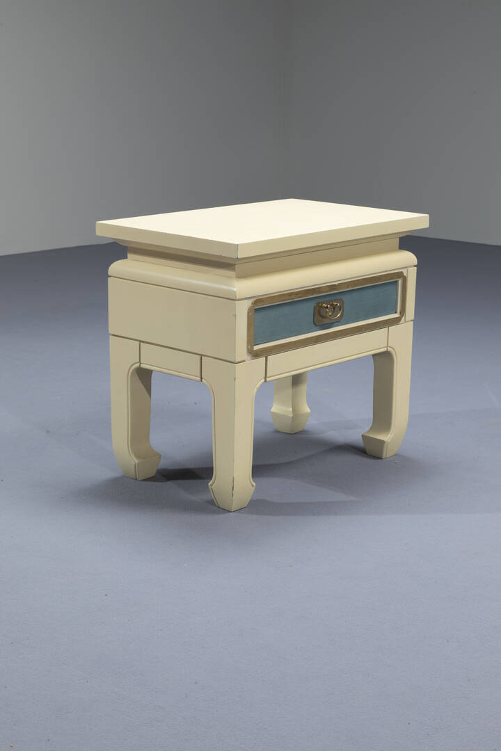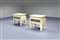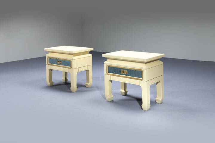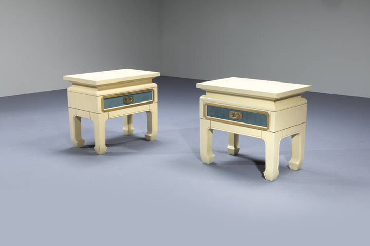 Coppia di comodini in legno laccato, fronte a un cassetto.