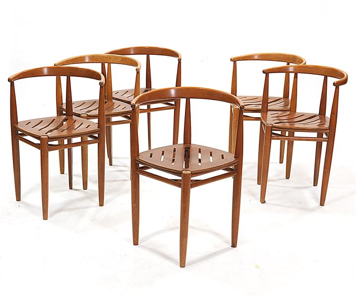 Sei poltroncine in legno di faggio tornito e curvato con sedile in compensato fustellato.