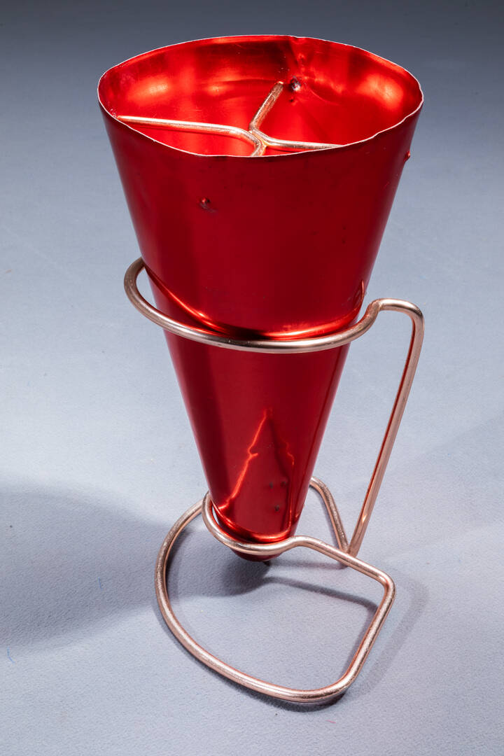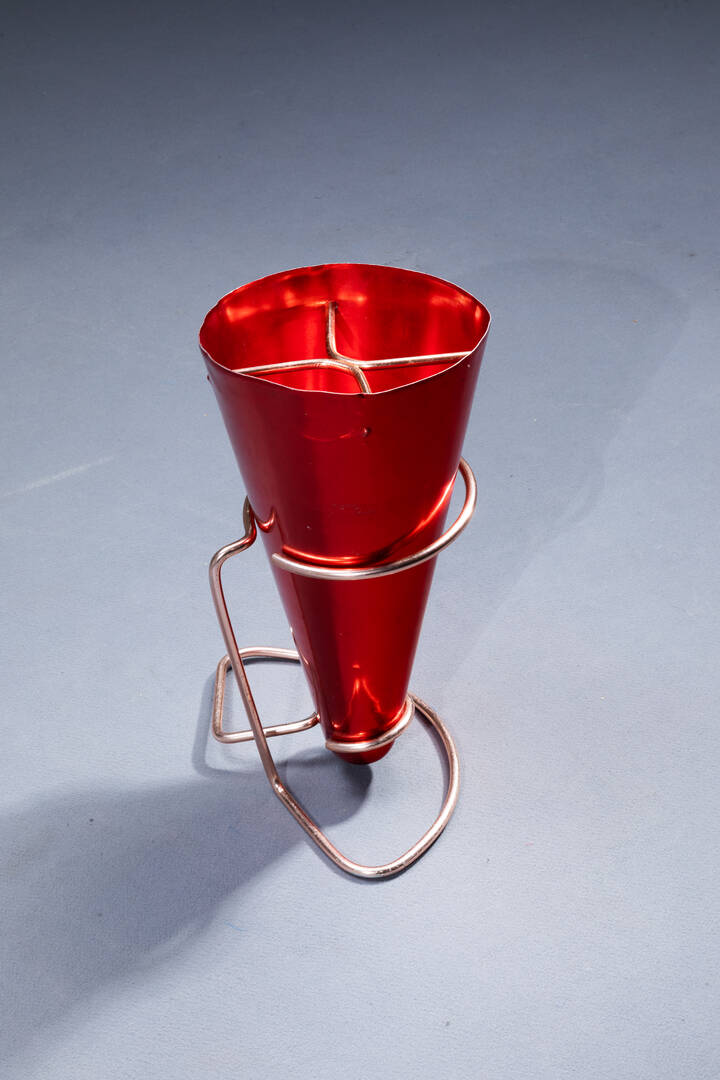Portaombrelli in lamiera tornita e tranciata di alluminio anodizzato, sostegno in tondino di alluminio anodizzato.