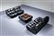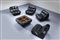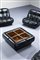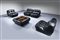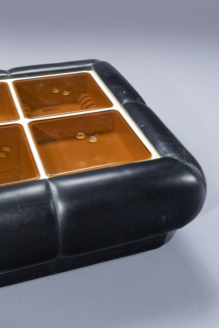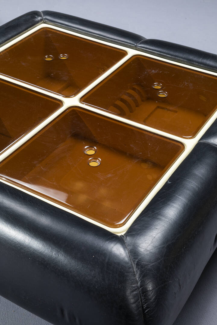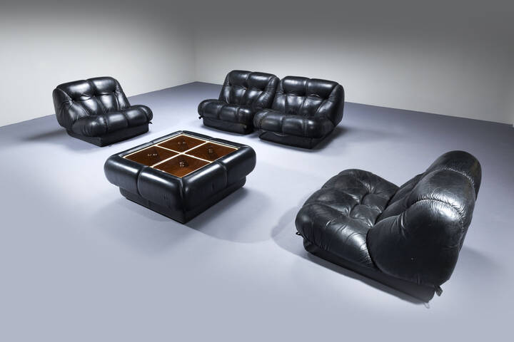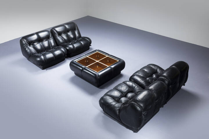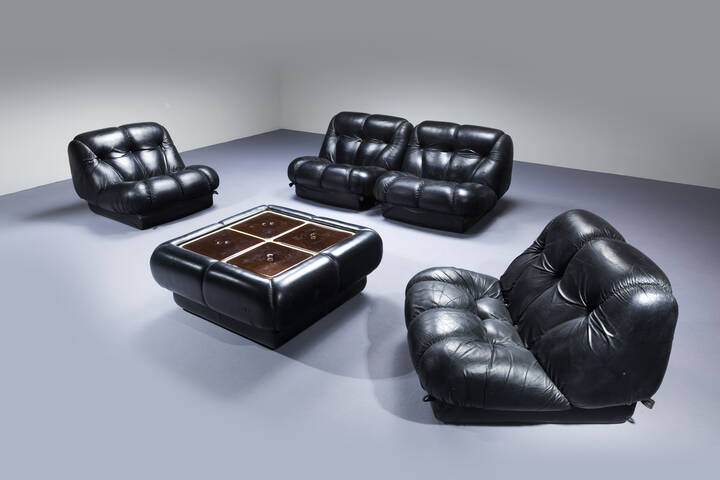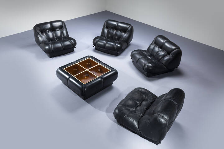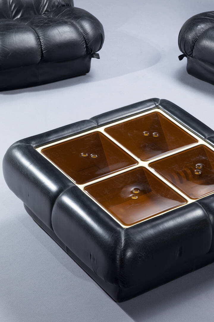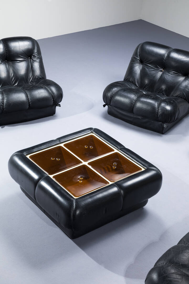 Sistema modulare composto da quattro poltrone e un tavolino rivestiti in pelle.