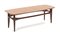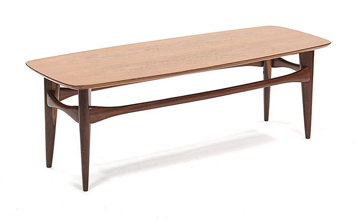 Tavolino in legno di teak con gambe unite da traverse rastremate al centro.