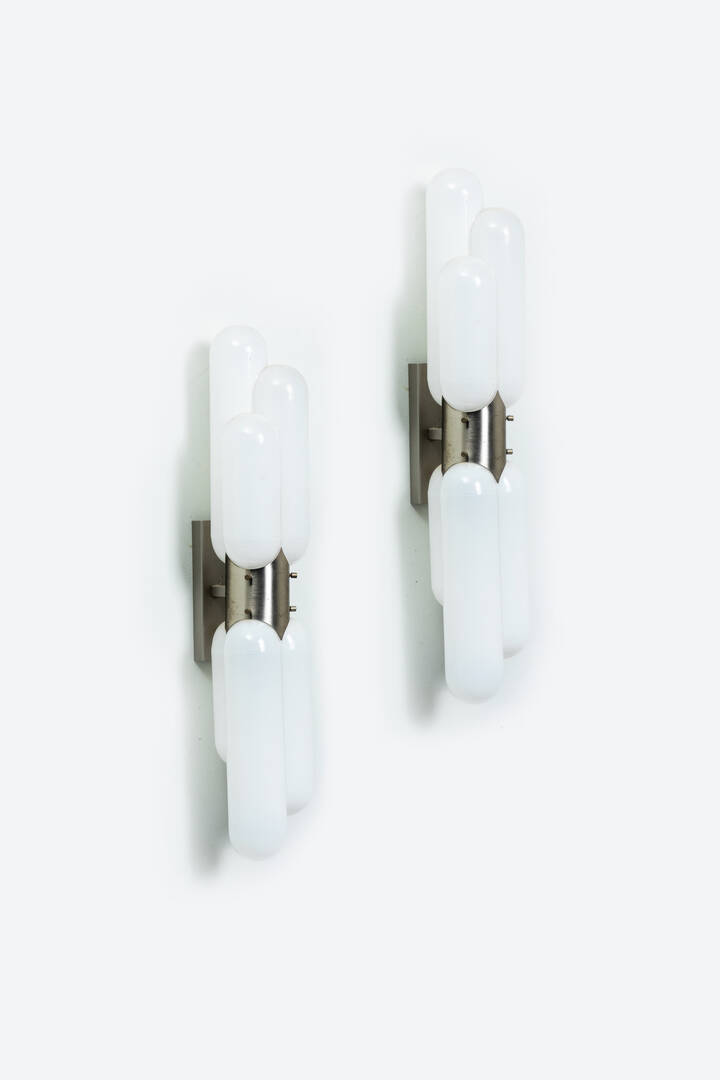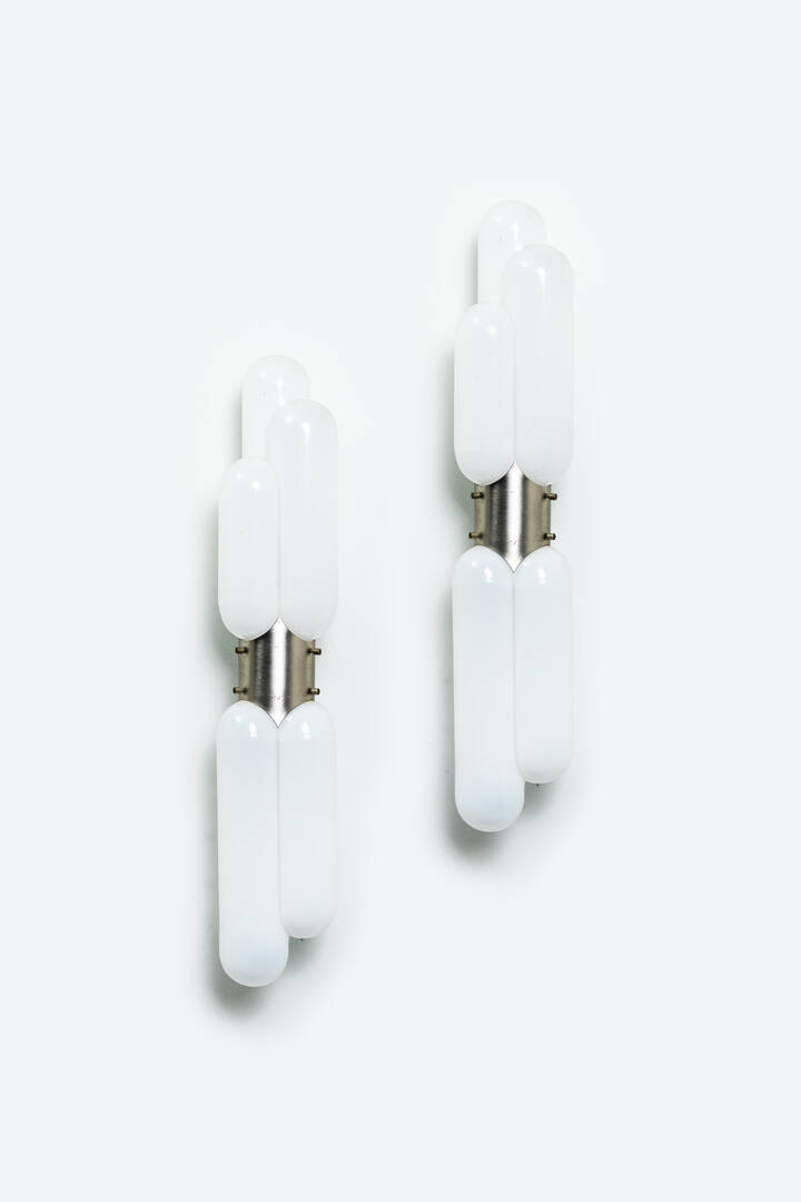 Coppia di appliques in metallo cromato, diffusori in vetro opalino