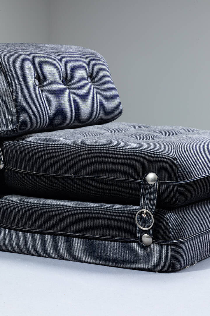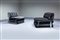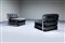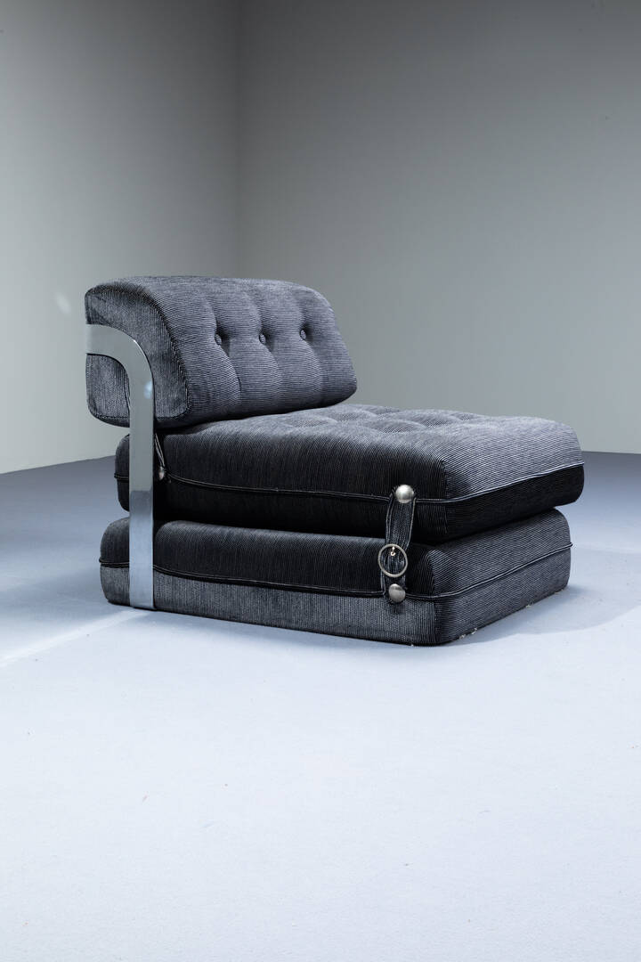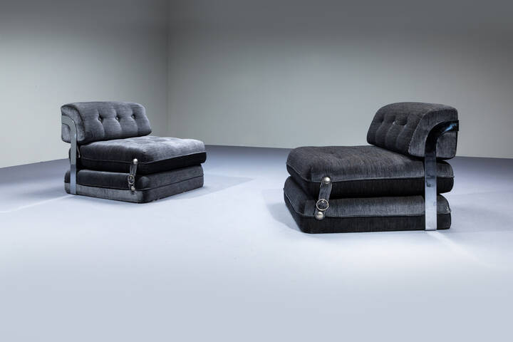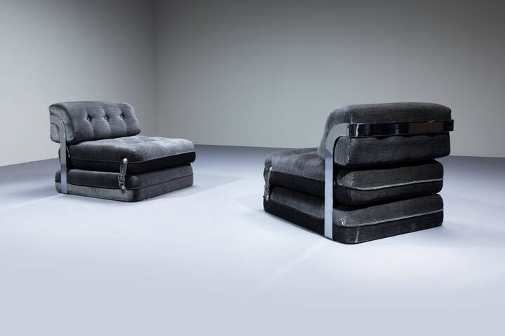 Coppia di poltrone in acciaio cromato, imbottitura rivestita in tessuto.