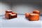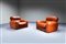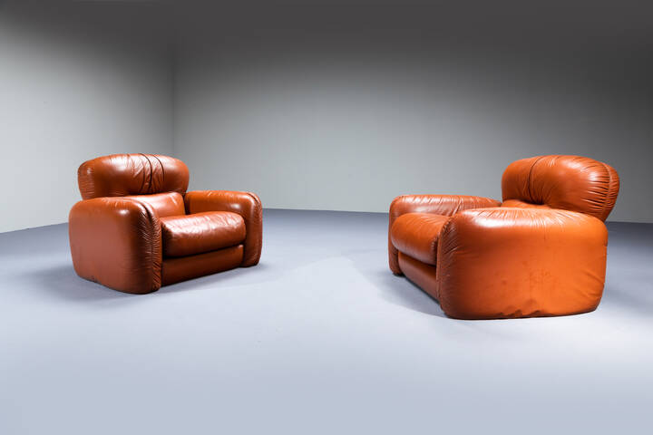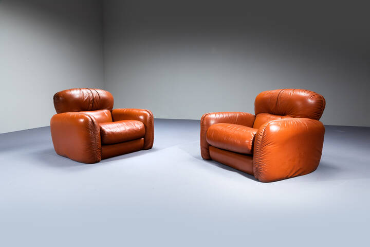 Coppia di poltrone con imbottitura rivestita in pelle.