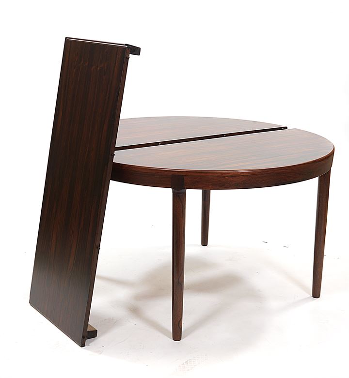 Tavolo allungabile in legno di palissandro, gambe smontabili. Fornito di due prolunghe in palissandro