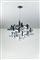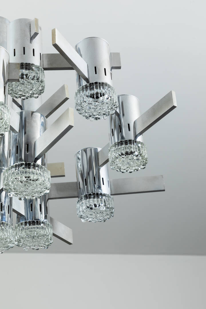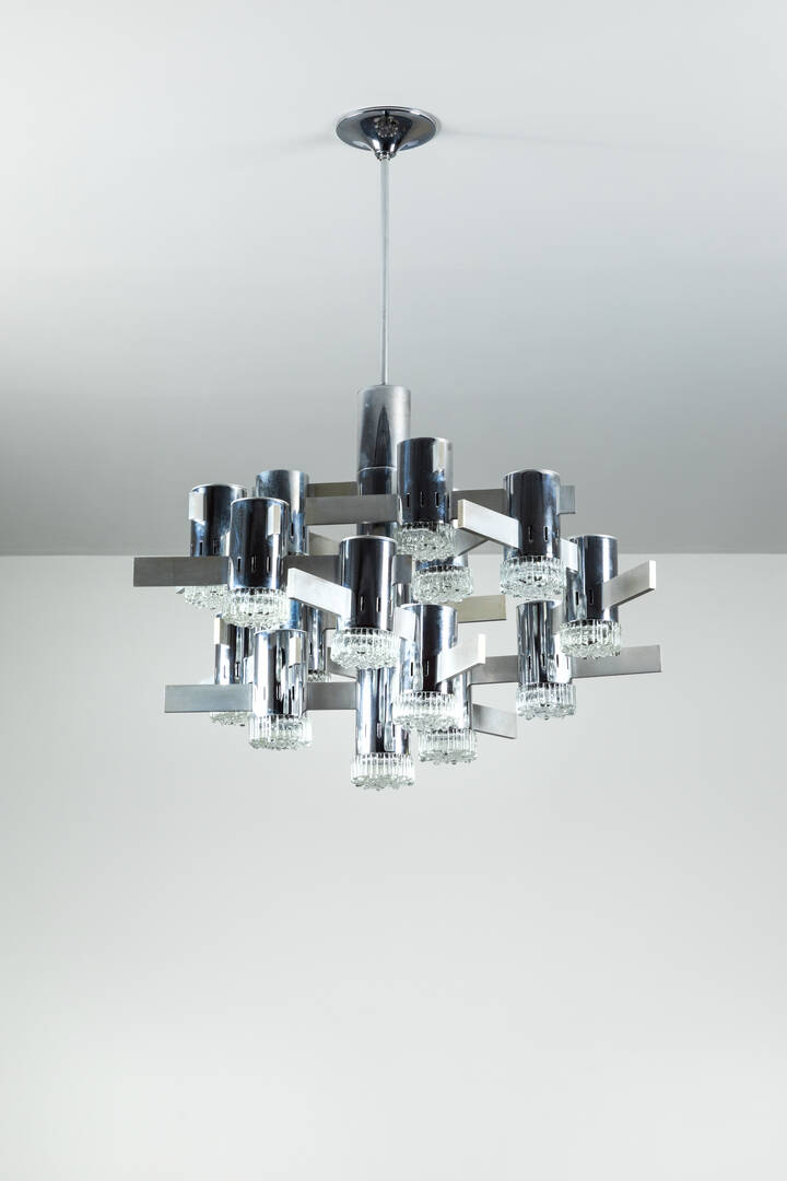 Lampadario con struttura in metallo cromato, diffusori in vetro.