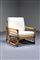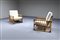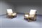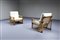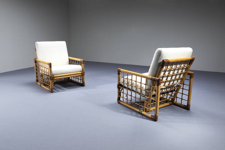 Coppia di poltrone in bamboo, particolari in ottone e cuscini imbottiti rivestiti in tessuto bouclè.