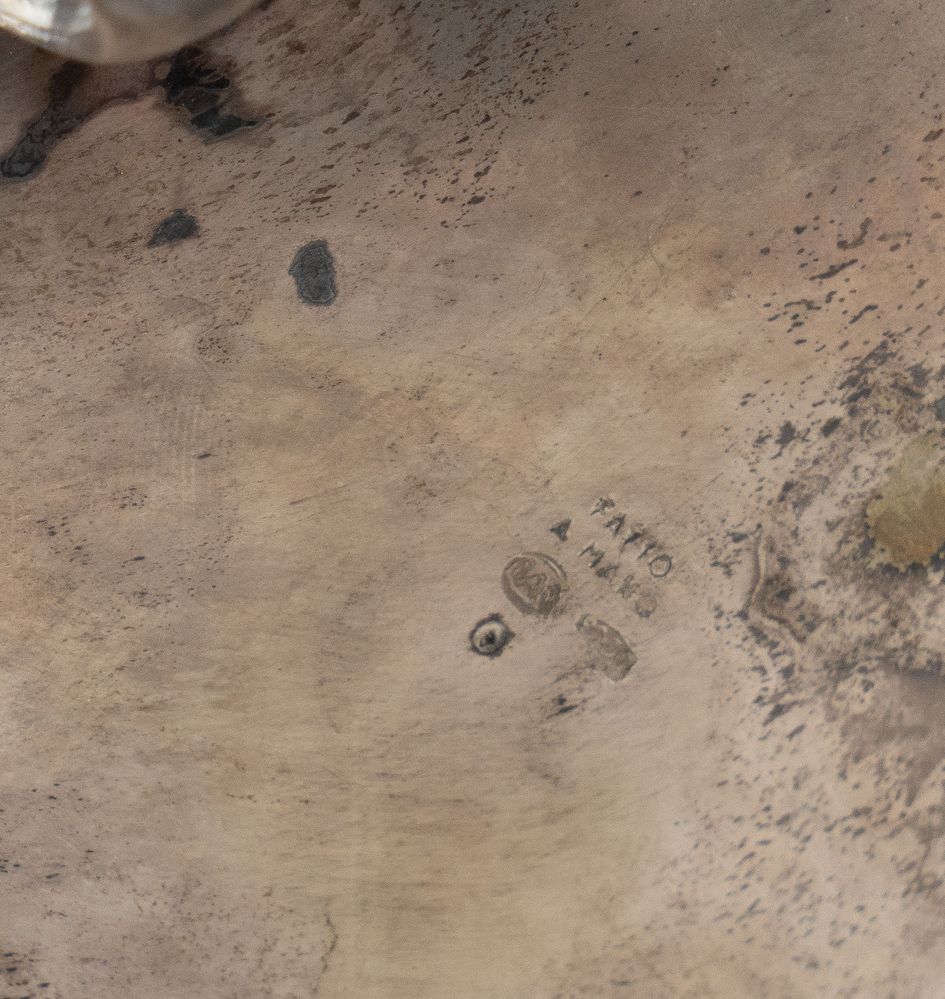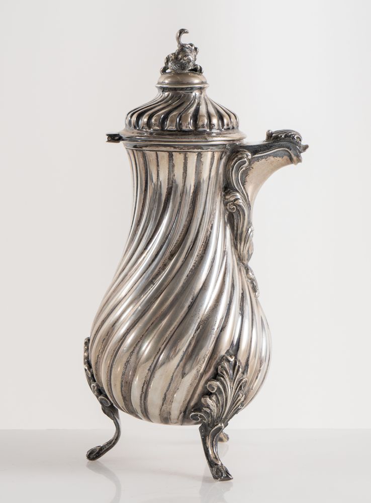 Bologna, XX secolo. Cioccolatiera in argento 800 con manico ligneo. Sotto la...