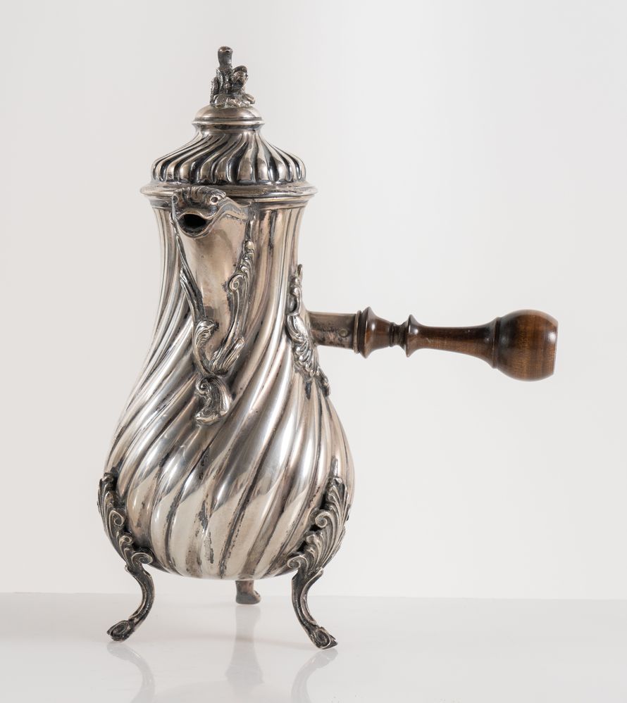 Bologna, XX secolo. Cioccolatiera in argento 800 con manico ligneo. Sotto la base reca punzoni: fatto a mano, 800 e losanga locativa bolognese. Cm 28x21x15. Peso complessivo: 929 gr.
