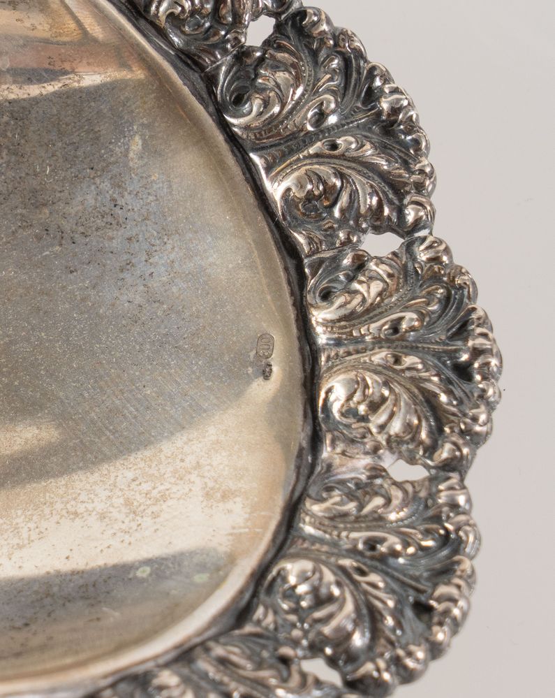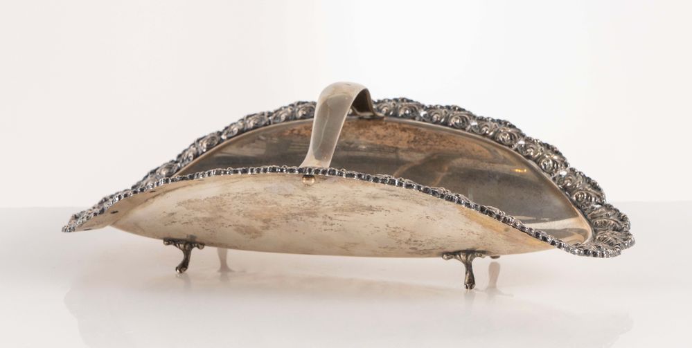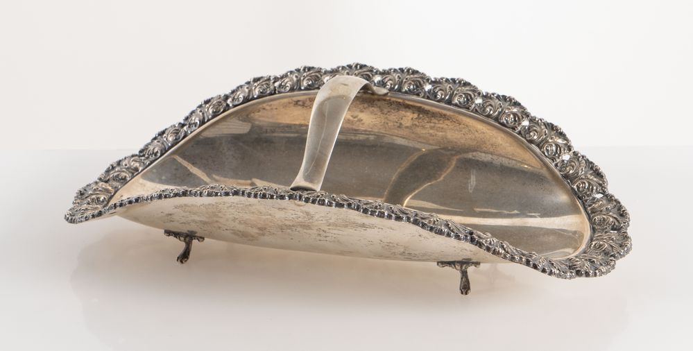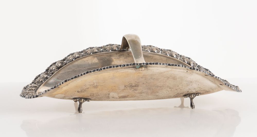 Italia, prima metà del XX secolo. Porta grissini in argento 800. Sul bordo superiore reca punzoni: 800 e losanga locativa non identificata. Cm 9,5x30,5x16,5. Peso: 367 gr. (restauro di una palmetta laterale)