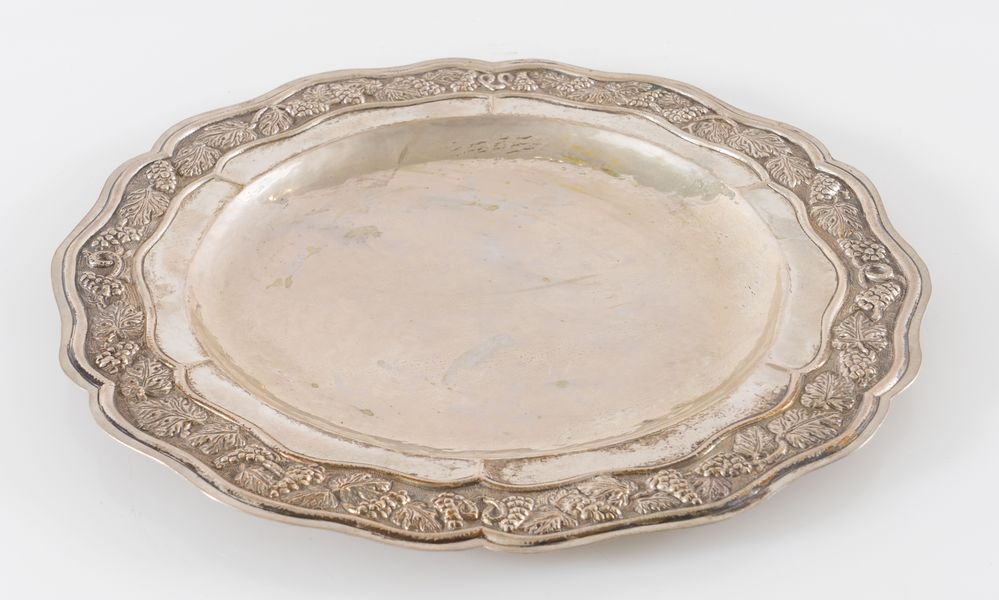 Argentiere veneziano dal 1968. Piatto in argento 925. Sul bordo reca punzoni: 925 e losanga locativa: 104VE. Diametro: cm 36. Peso: 722 gr.