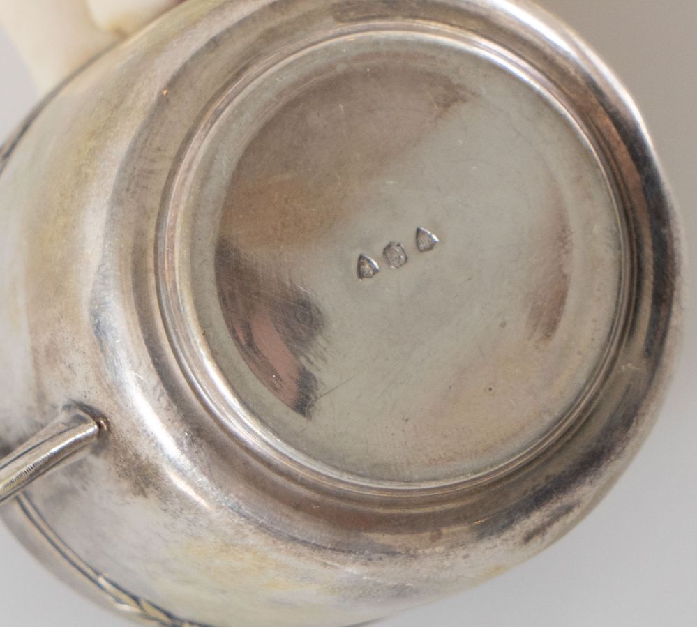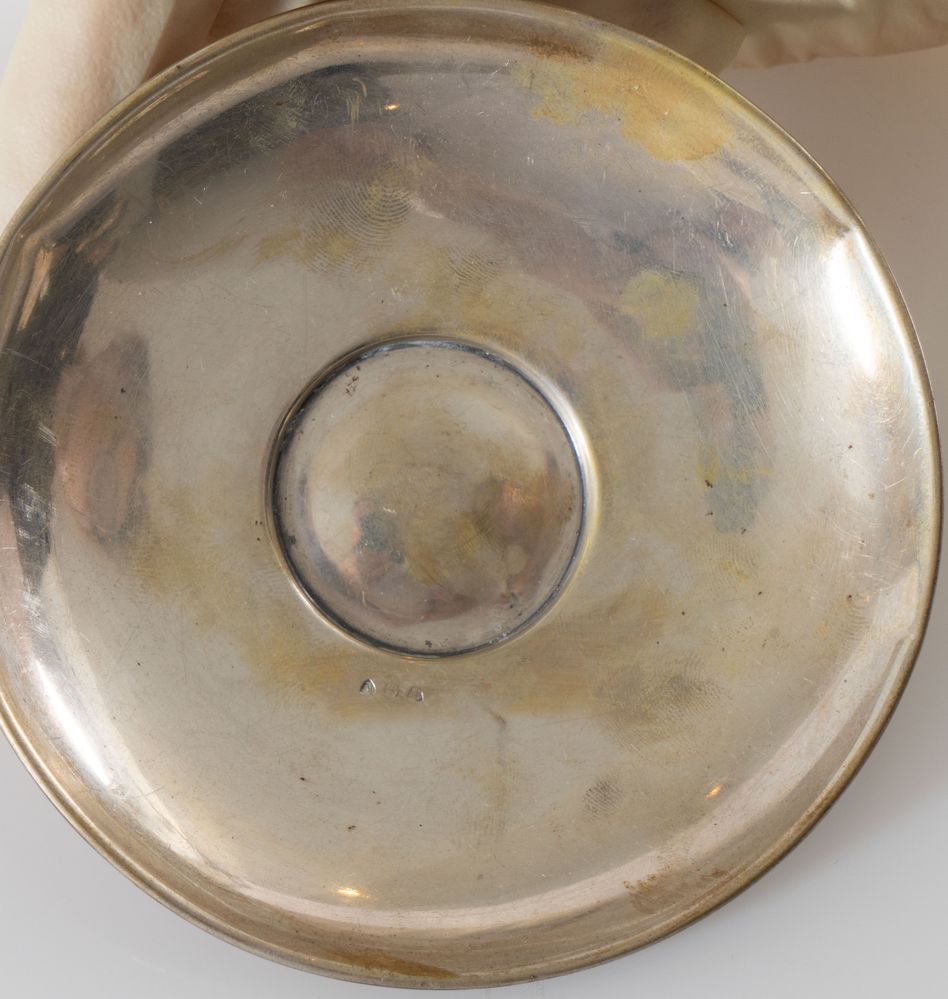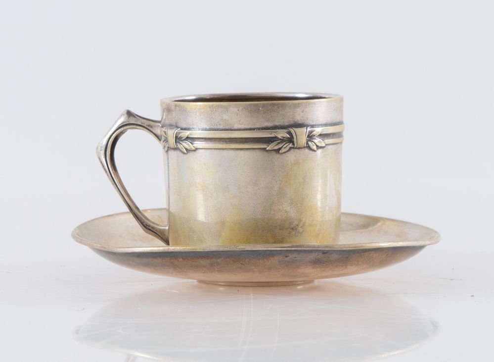 Lutz & Weiß GmbH - Pforzheim, Gemania, fine del XIX secolo - inizio del XX secolo. Tazzina e piattino in argento 800. Sotto la base recano: punzoni 800, luna e corona e stemma dell'argentiere. Cm 6x10,8x10,8. Peso: 75 gr.