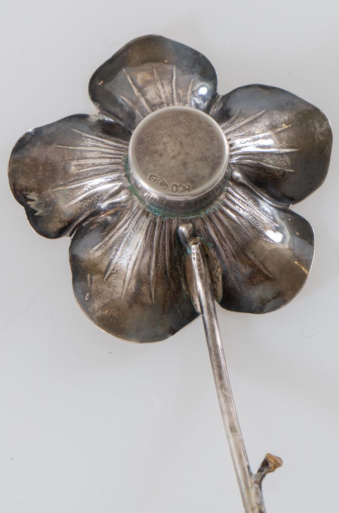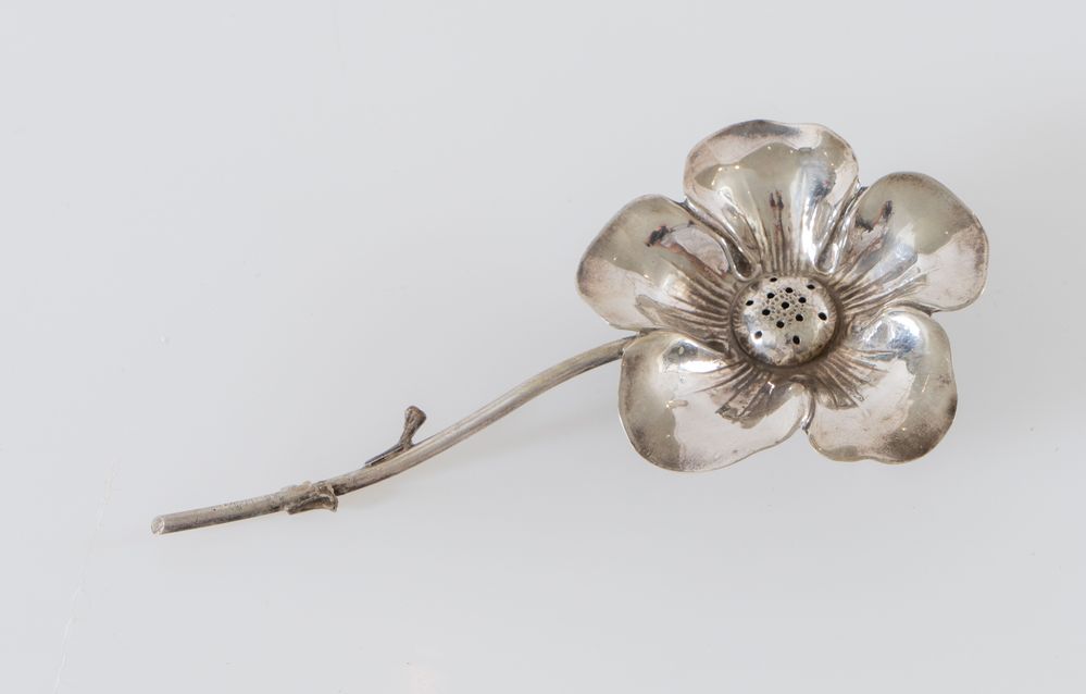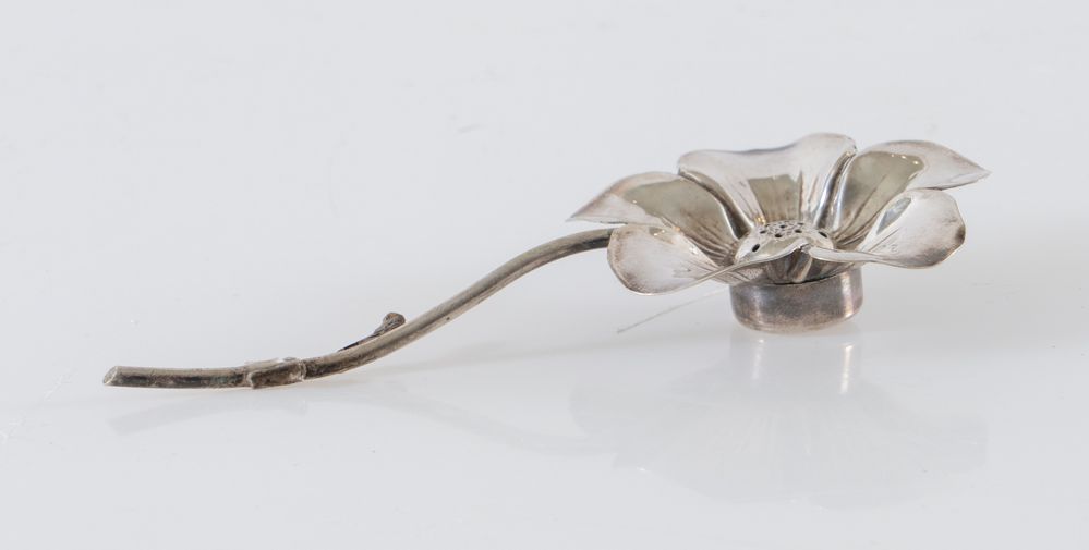 BRANDIMARTE, Firenze, XX secolo. Spargiprofumo in argento 800 a forma di fiore. Sotto la base reca punzoni 800 e losanga locativa 283FI. Cm14X6,5X2. Peso: 27 gr.