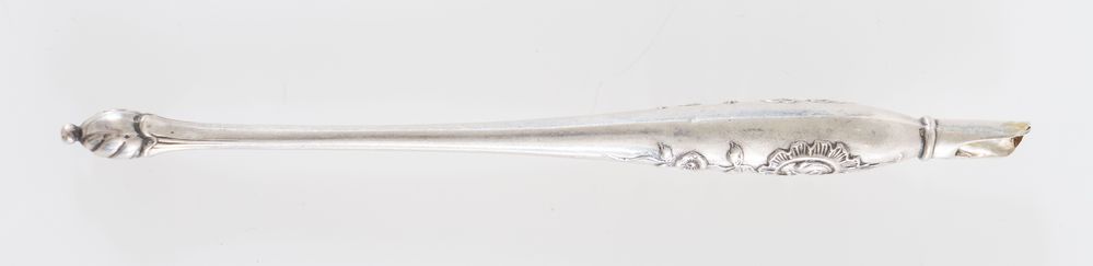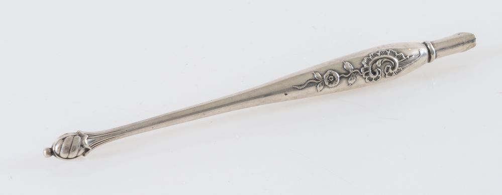 Penna in argento. Non reca punzoni evidenti. Lunghezza: cm 15,6. Peso: 11 gr.