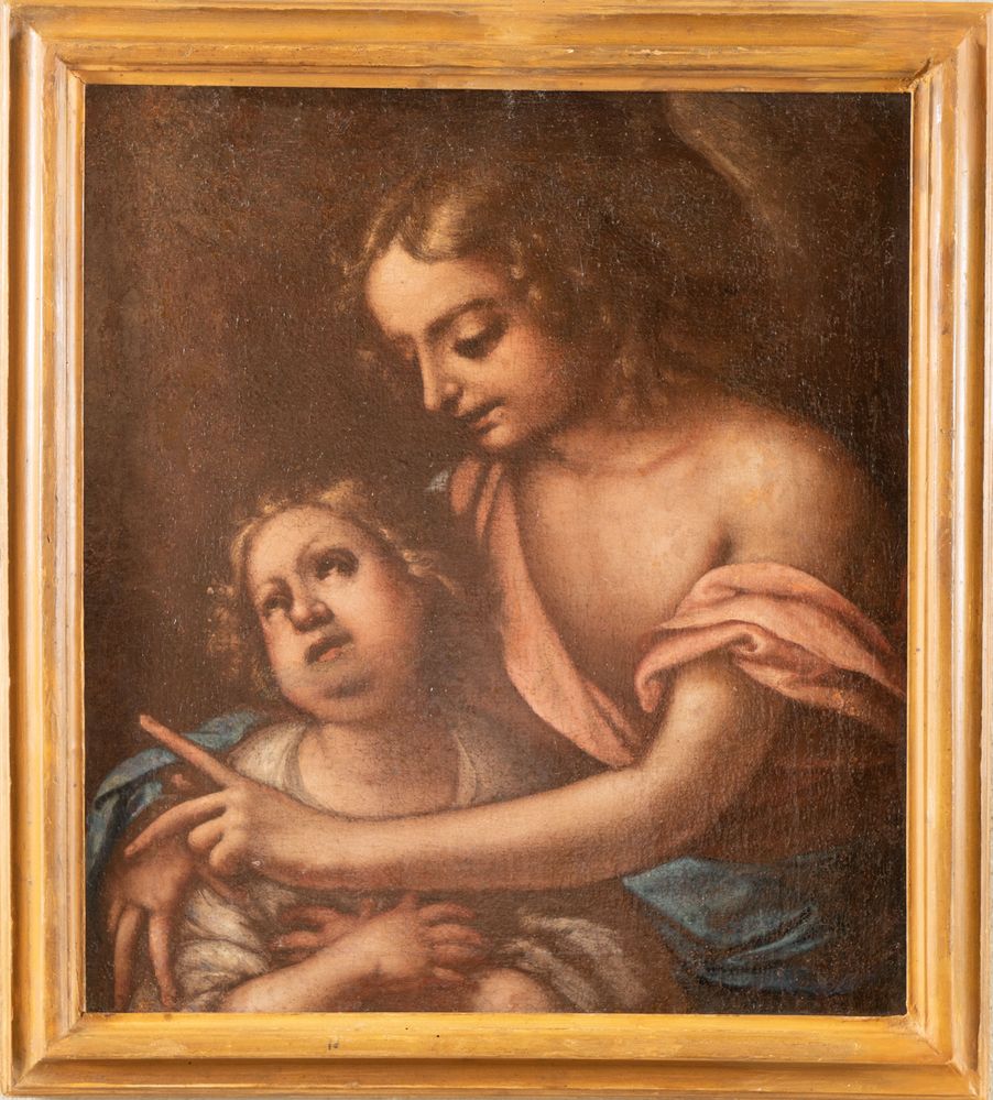 Maestro lombardo del XVIII secolo "Tobia e l'angelo". Olio su tela. Cm 64x58.