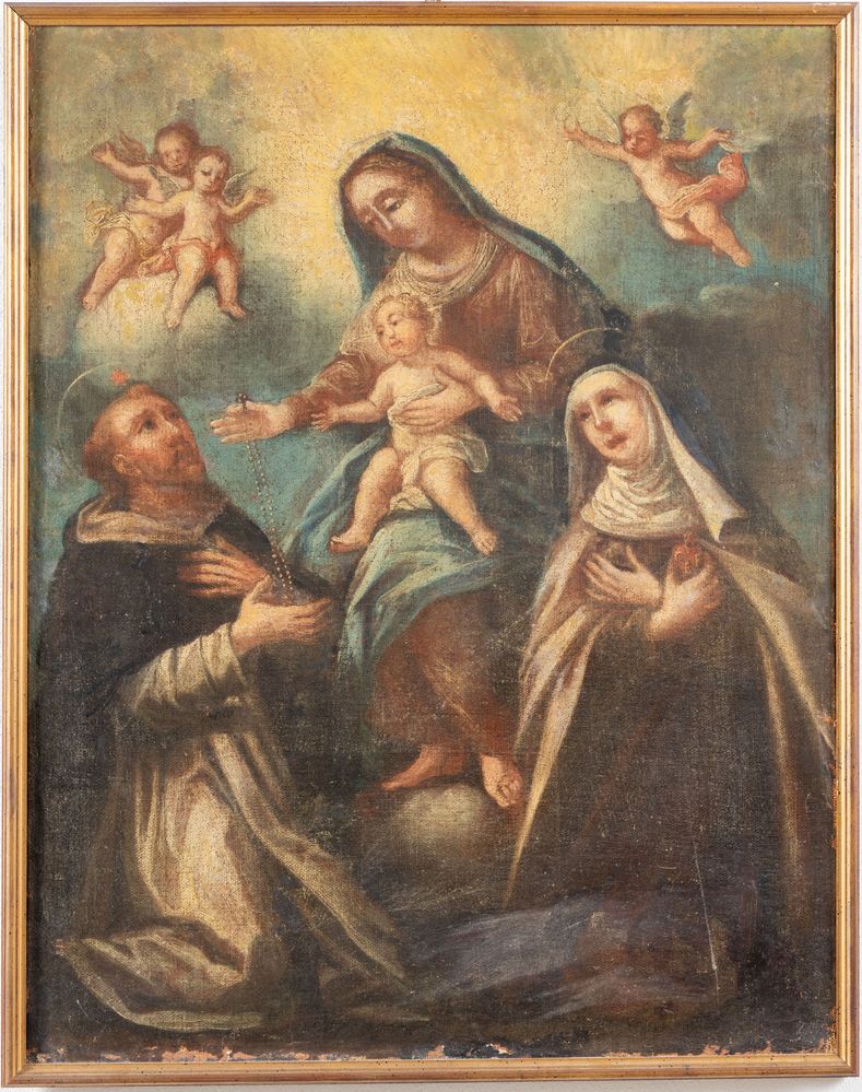 Meastro del XVII secolo. "Madonna del Rosario con santi". Olio su tela. Cm 70x57.