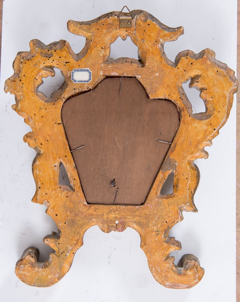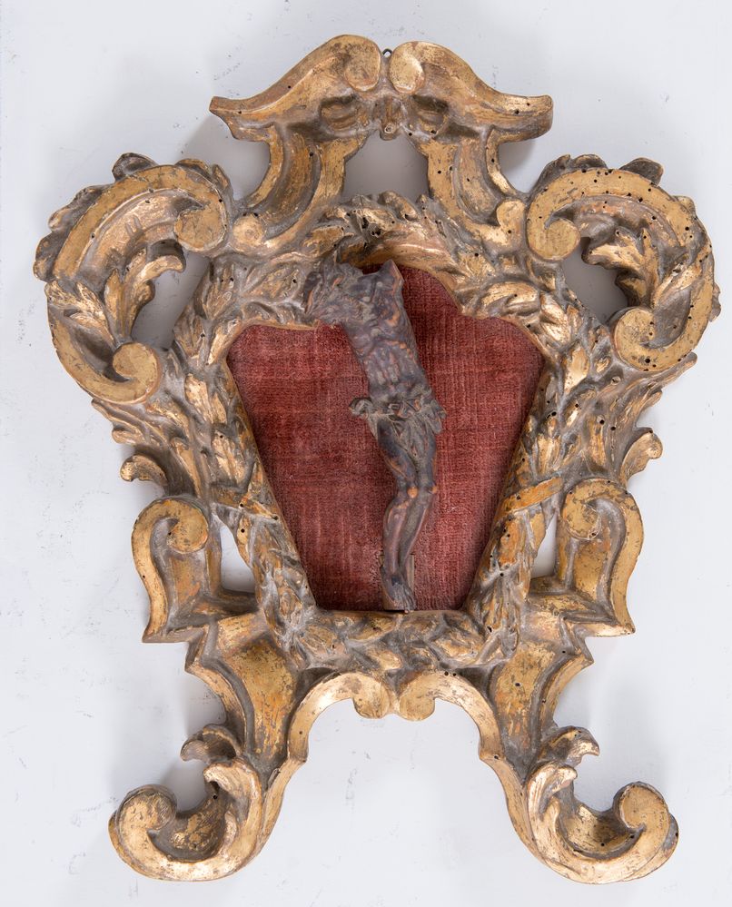 Coppia di cantaglorie in legno intagliato dorato. Una reca frammento di crocifisso. Emilia, metà del XVIII secolo. Cm 34x26,5. (lievi difetti)