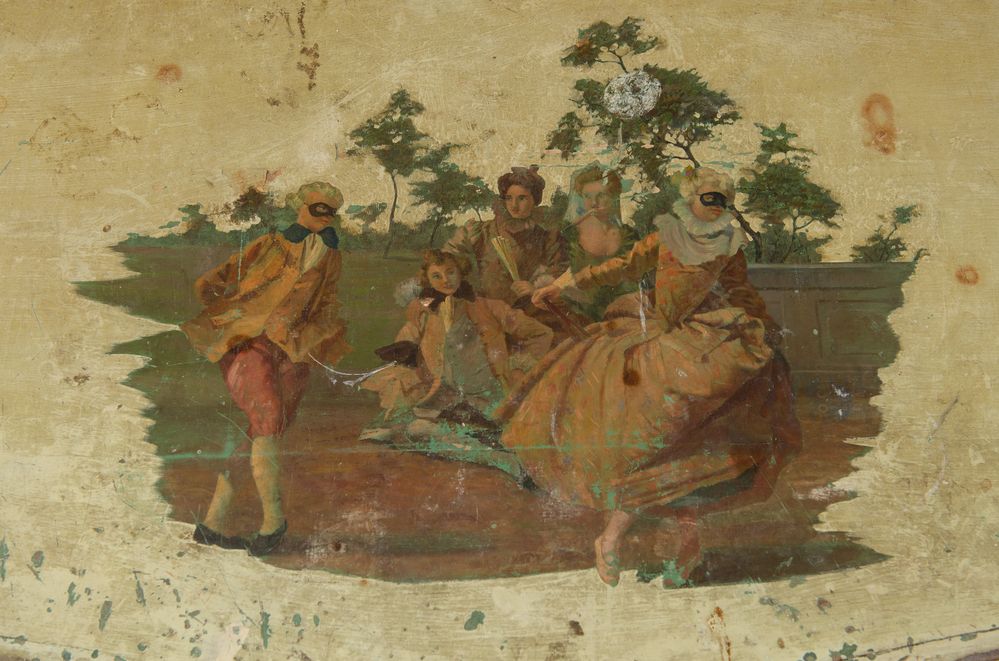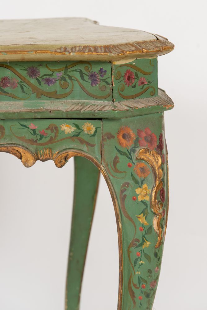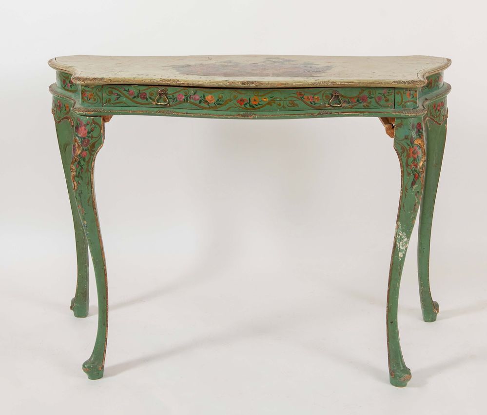 Consolle in legno intagliato e laccato con scena di genere sul piano. Ad imitazione di un mobile veneziano del Settecento, ma realizzato negli anni '30 del XX secolo.Cm 86x123x56.