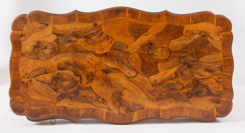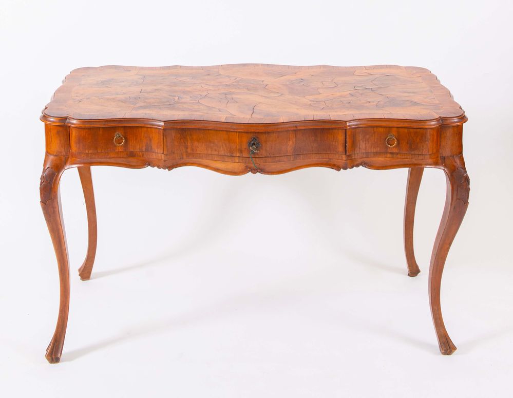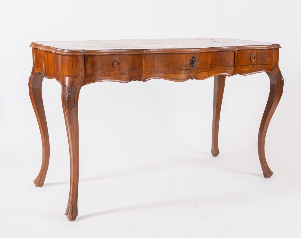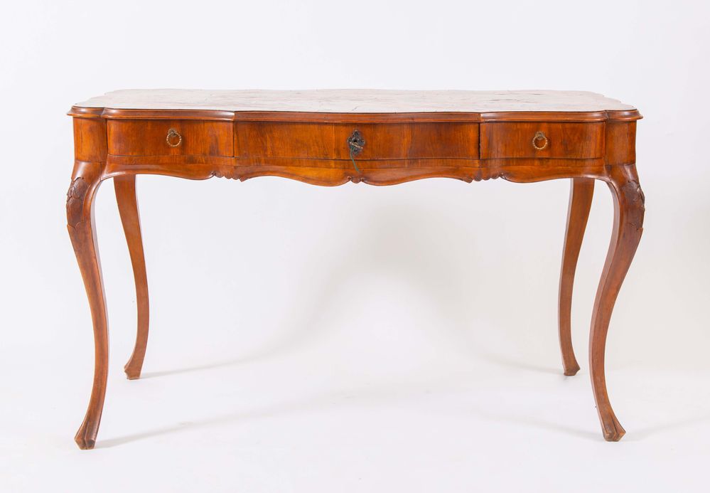 Tavolo scrittoio in stile Luigi xv lastronato in radica di noce e noce. Reca tre cassetti in fascia, piano mistilineo e sostegni di linea mossa. Italia, anni 30/50 del XX secolo.