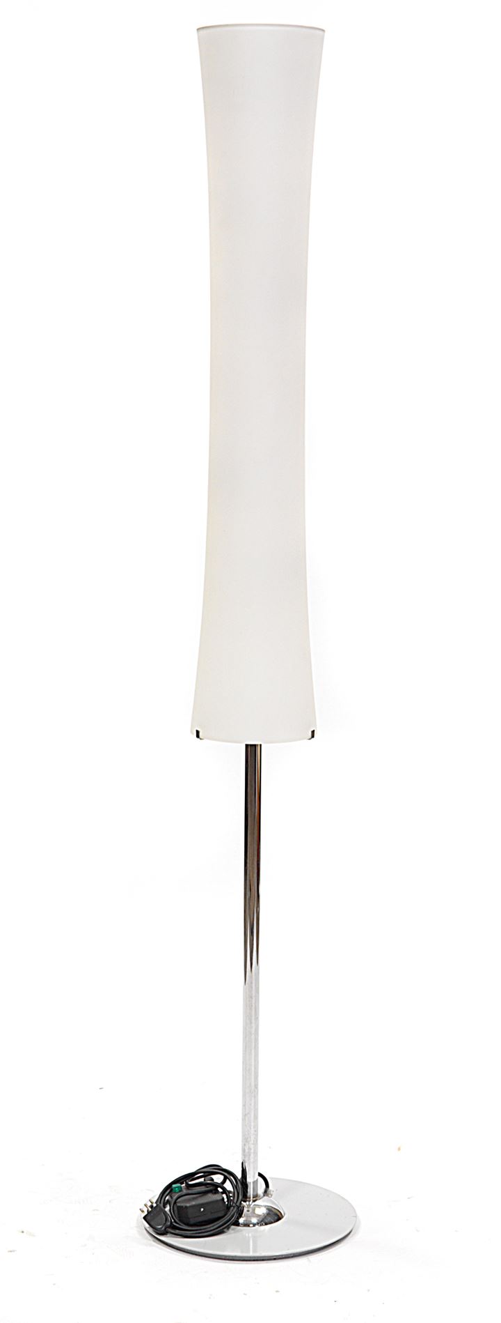 Lampada con diffusore costituito da un grande elemento a clessidra in vetro opalino satinato sorretto da uno stelo in metallo cromato su piedistallo in metallo laccato bianco.