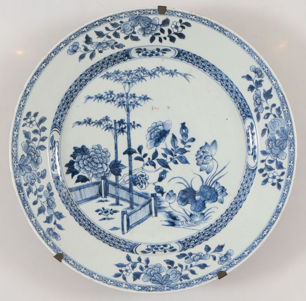 Grande vassoio in porcellana monocroma blu con peonie e fiori vari, bambù entro "cancelletto". Cina, XVIII secolo. Diametro cm 38,9. Sbaccature al bordo.