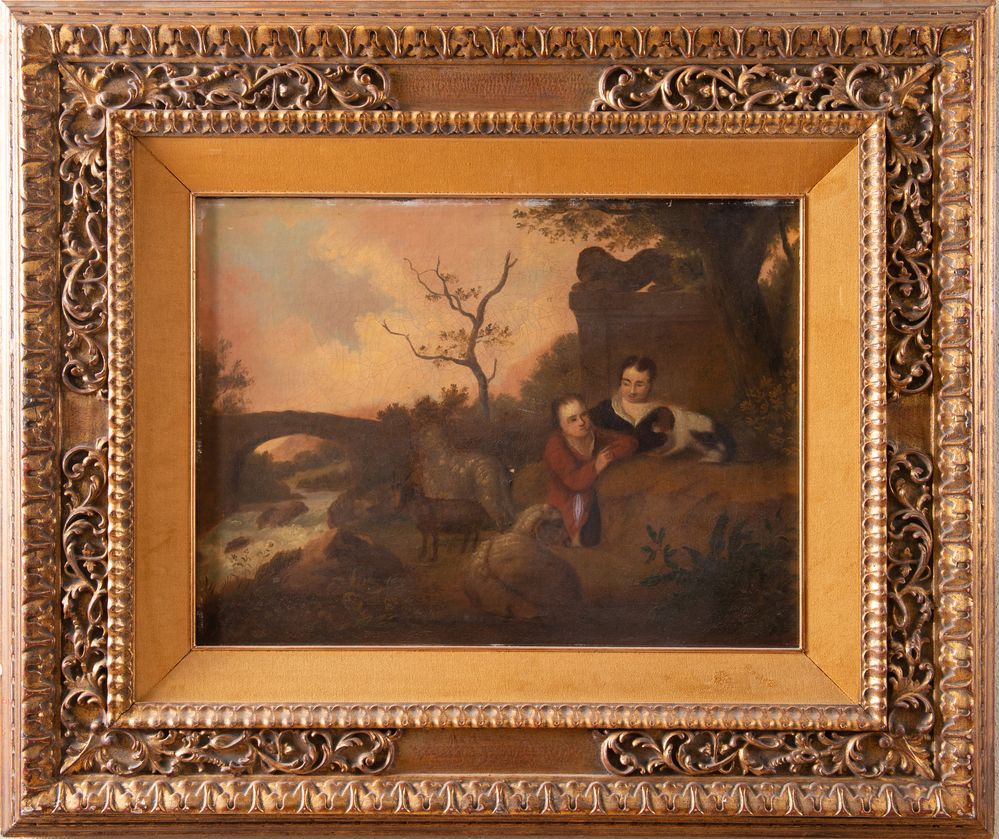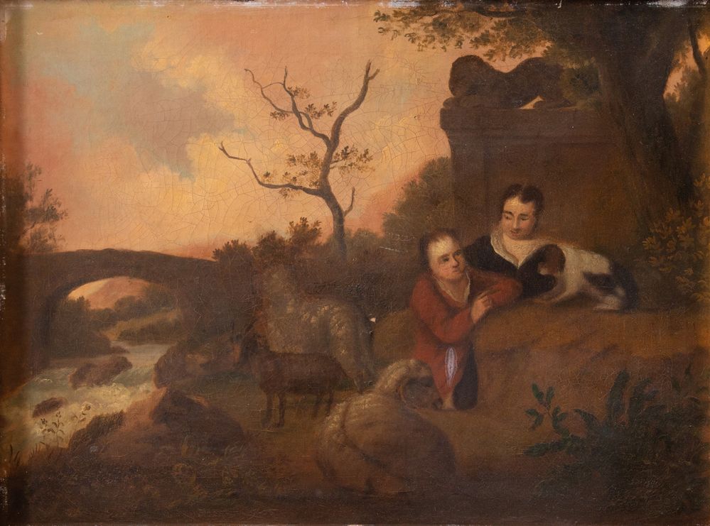 Maestro del XIX secolo. " Paesaggio con figure". Olio su tela. Cm 43x58.