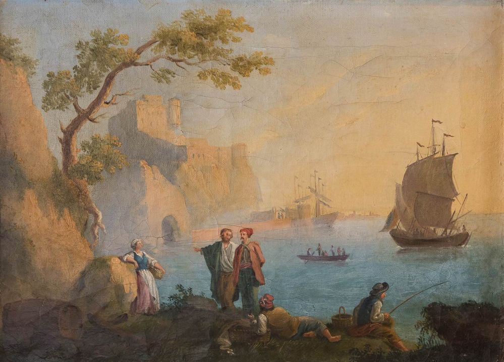 Maestro degli inizi del XIX secolo. Coppia di marine. Olio su tela. Cadauno di cm 34x47.