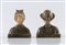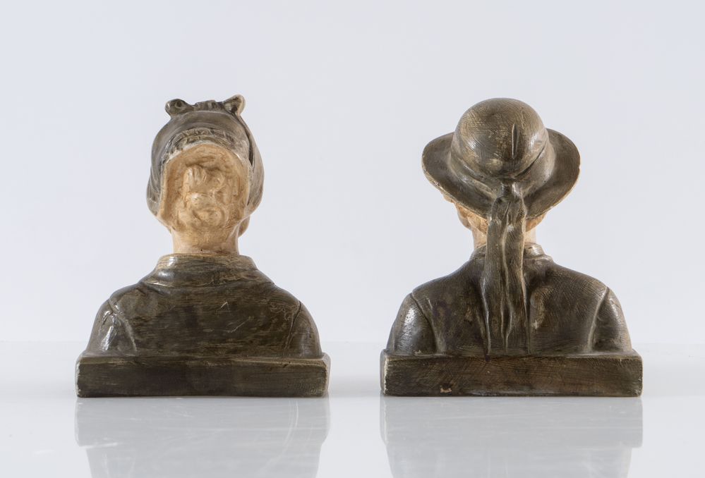 Coppia di busti raffiguranti anziani in gesso patinato terracotta. Francia, seconda metà del XIX secolo. Donna: cm 15x12,5x9,5. Uomo: cm 15,5x13x8.