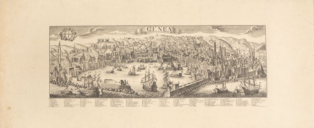 Georg Balthasar Probst (Germania, 1673 - 1748). Veduta panoramica della città di Genova. Stampa antica. Cm 35x83. In basso reca legenda con settanta luoghi d'interesse.