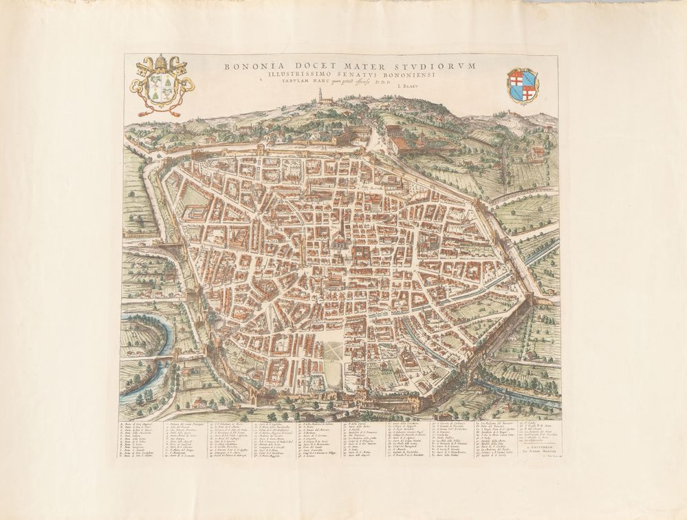 Mortier Pierre (Leida 1661 – Amsterdam 1711); Blaeu Johann (Alkmaar 1596 – Amsterdam 1673). Veduta aerea della città di Bologna. Stampa antica. Cm 59x78. Stampata ad Amsterdam. Edizione: Ponte Vecchio.