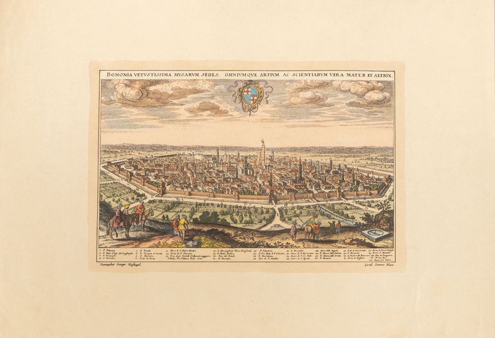 Matthäus Merian il vecchio (Basilea 1593 – Bad Schwalbach 1650); Blaeu Johann (Alkmaar 1596 – Amsterdam 1673). Bononia vetustissima musarum sedes. Stampa antica. Cm 41,5x59,5. Dipinta da Georg Hoefnagel.