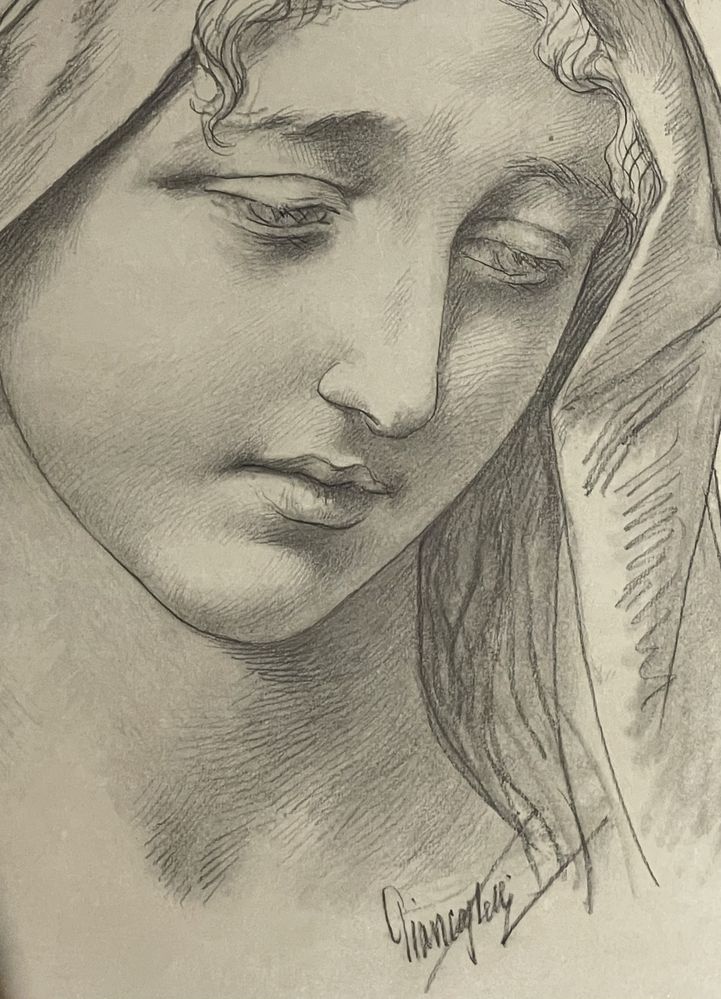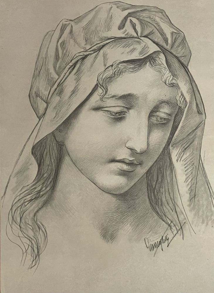 GIOVANNI PIANCASTELLI (Castel Bolognese 1845 - Bologna 1926) “Madonna”. Cm 47x35. Disegno a matita su carta. Opera firmata in basso a destra Piancastelli.