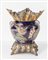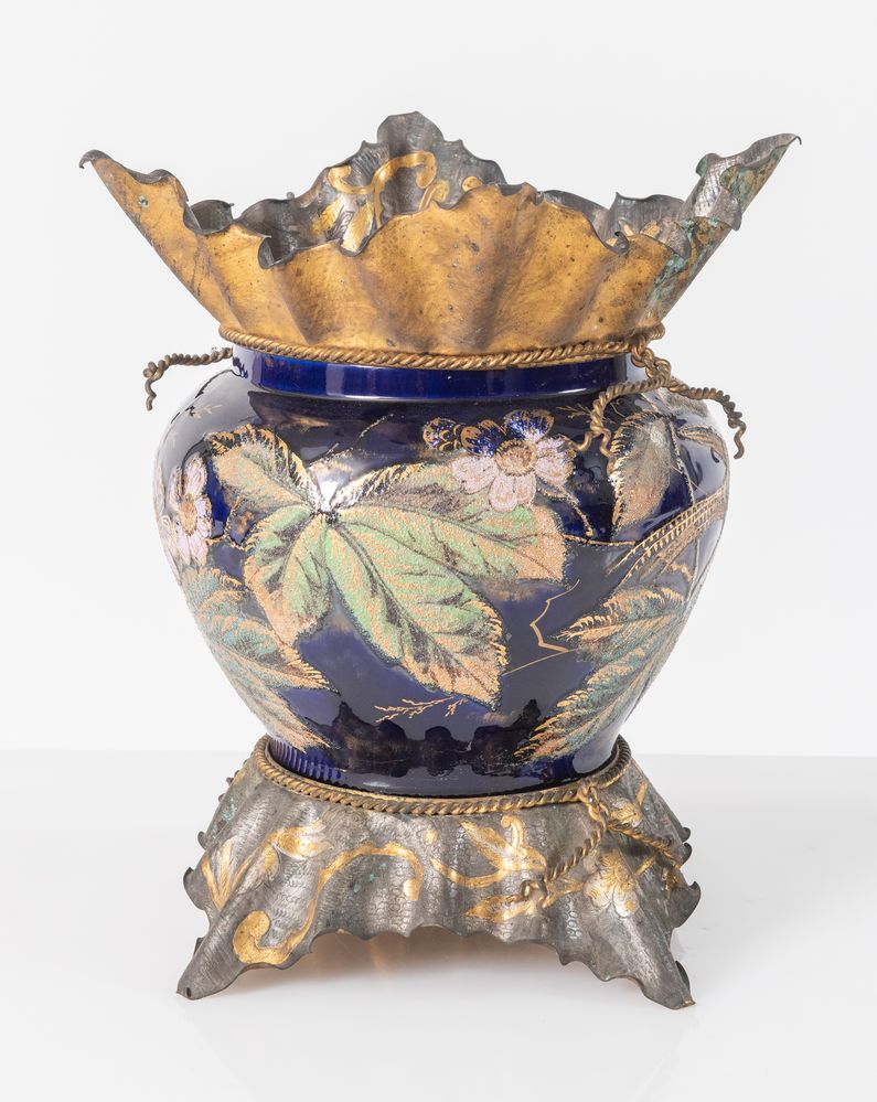 Vaso in porcellana blu con decori a fiori e foglie a rilievo in sabbia e applicazioni sul collo in bronzo dorato. Francia, fine XIX - inizi XX secolo. Cm 38x34,5x34,5.