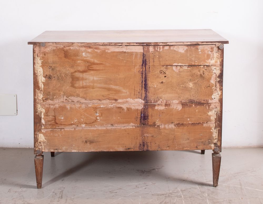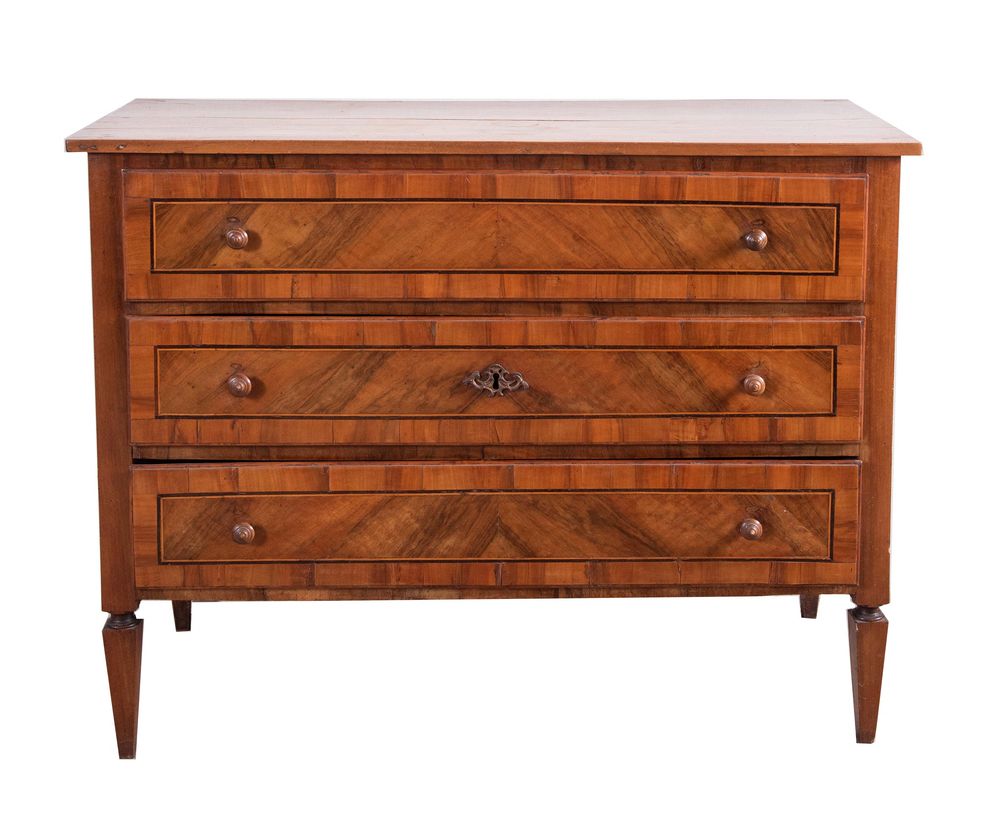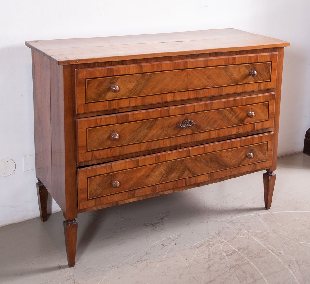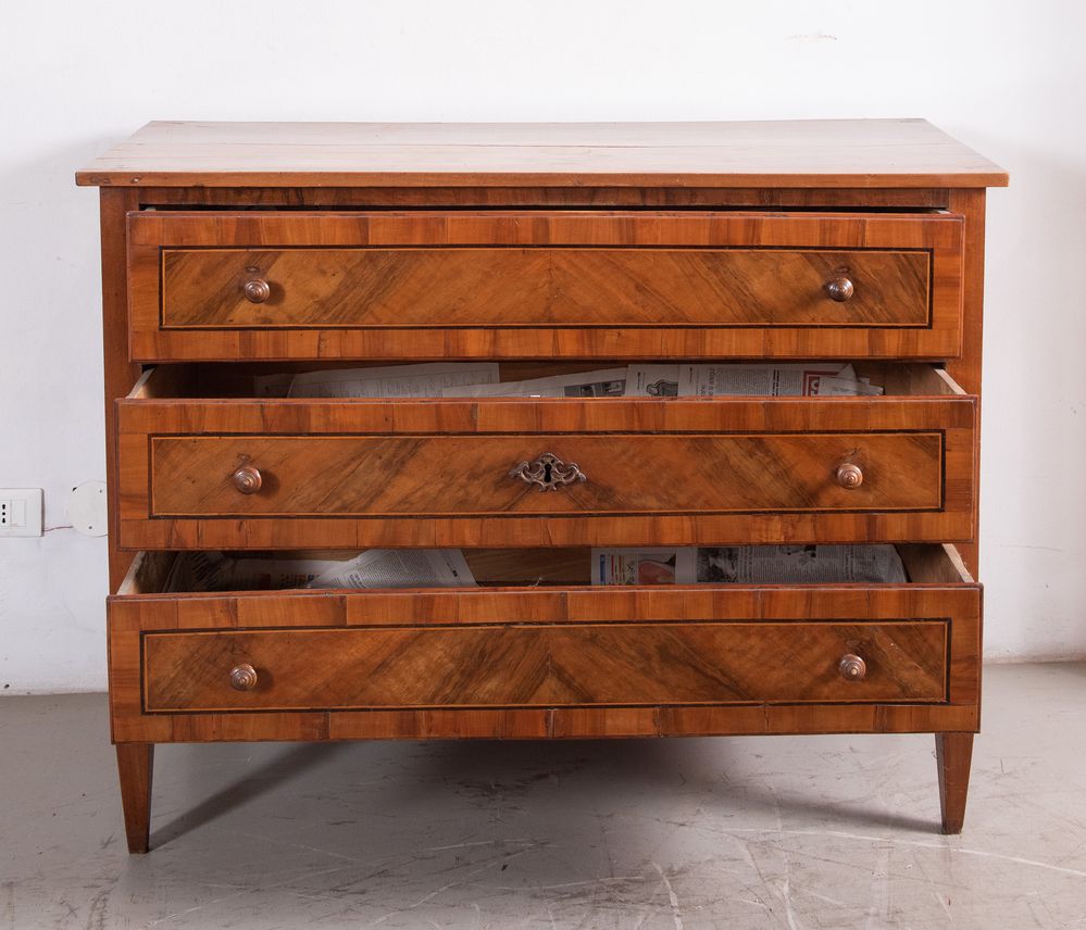 Cassettone in massello di noce, con cassetti lastronati in piuma di noce e ciliegio con filettature in acero ed ebano. Emilia, fine del XVIII secolo - inizi del XIX Secolo. Cm 97x126x54.