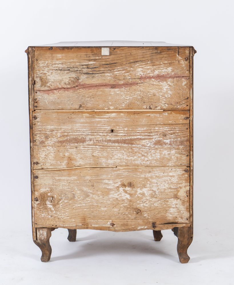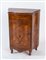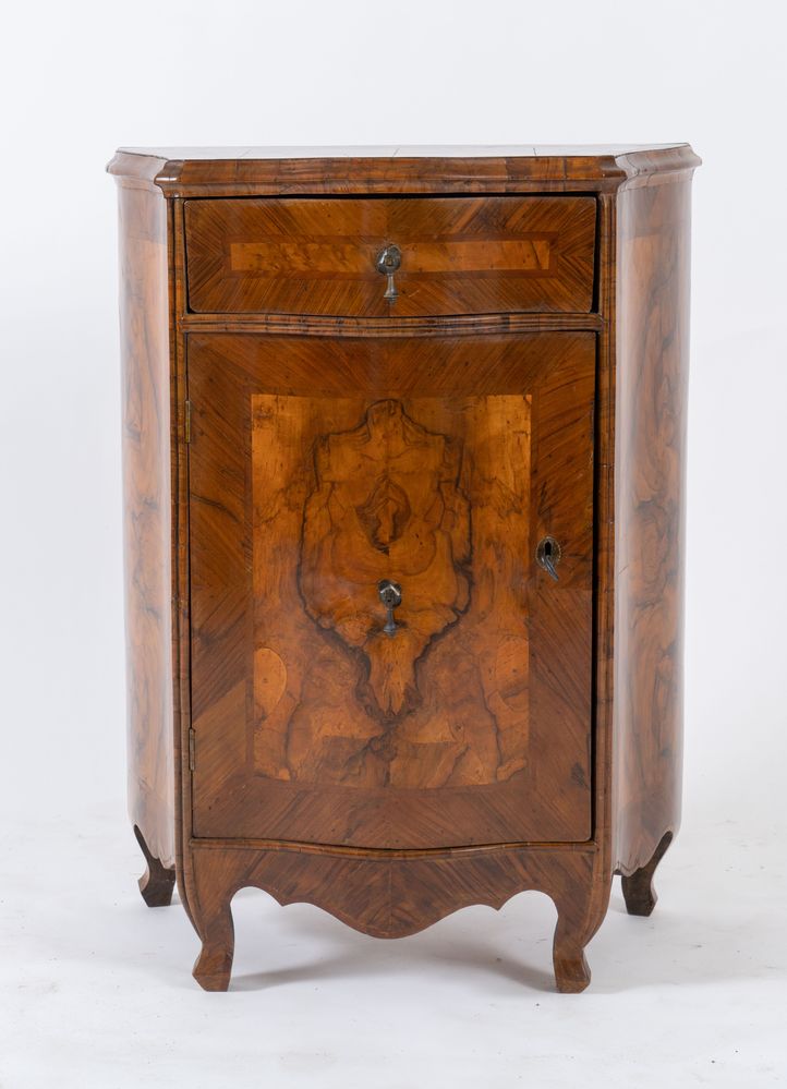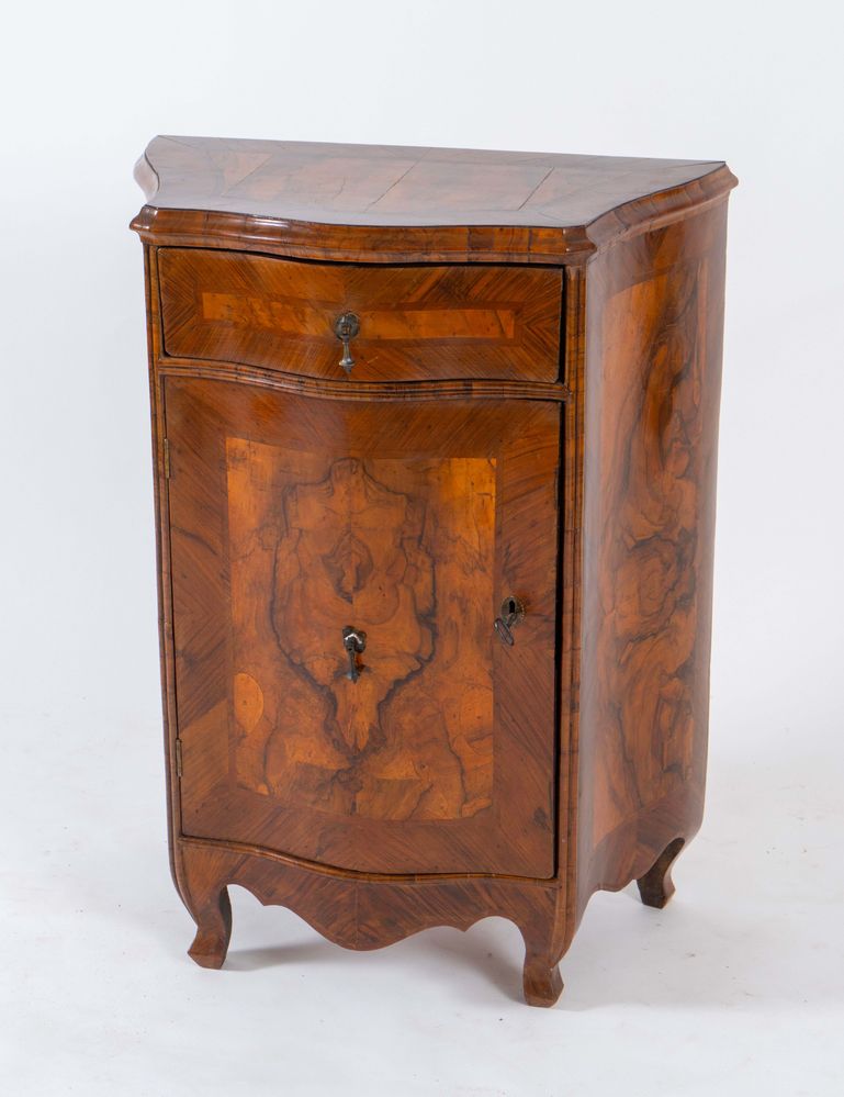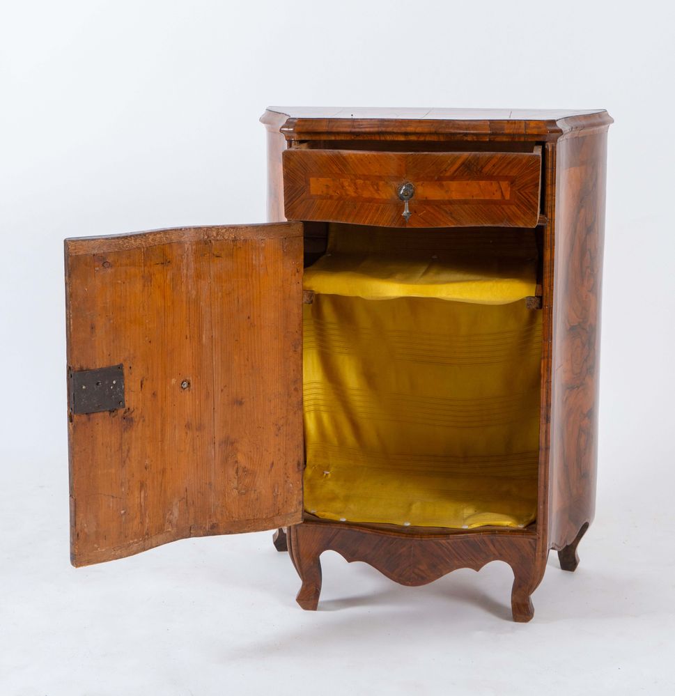 Comodino lastronato in radica di noce e rigatino con filettature in tasso. Veneto, metà XVIII. Reca fronte e fianchi leggermente mossi e piedi leggermente sagomanti. Buono stato di conservazione: non presenta sostanziali rifacimenti. Cm 76x58,5x31.