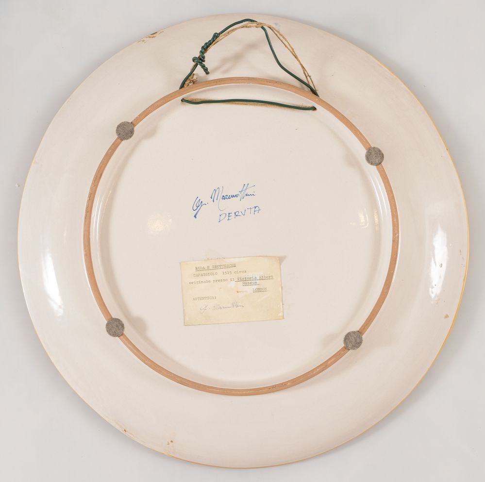MAIOLICHE G. MARMOTTINI "Leda e il cigno". Grande piatto in maiolica policroma di Deruta. Diametro cm 51,5. Altezza cm 6. Alla base firmato G. Marmottini Deruta. Copia da Jacopo (Maestro), Cafaggioli, 1515 ca. Al retro reca cartiglio firmata G. Marmottini.