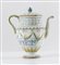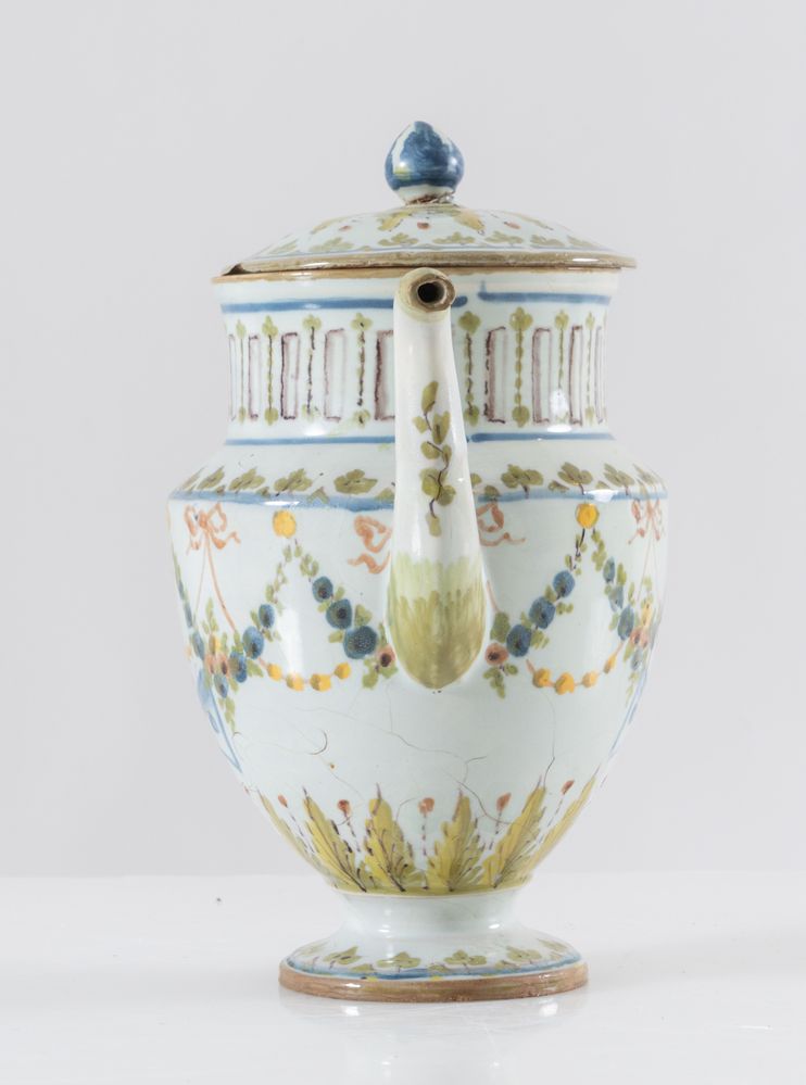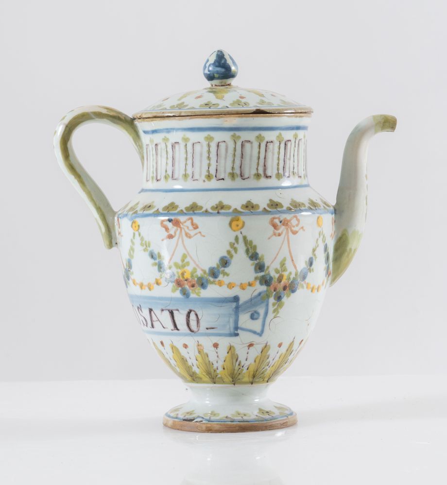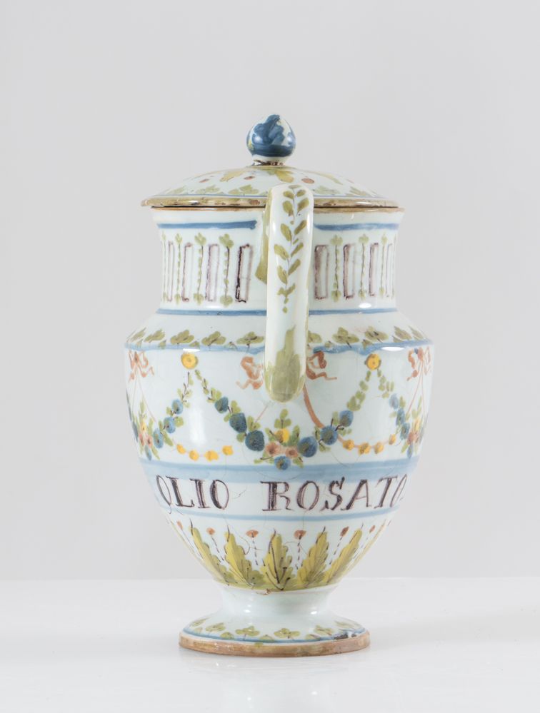 MANIFATTURA FERNIANI FAENZA Brocca da farmacia con iscrizione farmaceutica olio rosato. Fine XVIII secolo. Cm 21. Alla base reca marca M.M.H. Farmacia Malvezzi Hercolani. (restauro nel beccuccio e nel pomello)